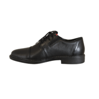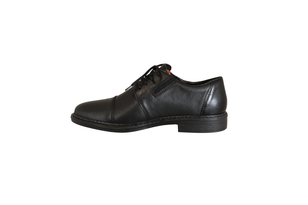 RIEKER 17625-00 SORT (162-0797). Sort skind snøresko med polstering i indersålerne, så skoen er blød at gå med. Hel enkelt med en syning over tåen og en tynd gummisål. En meget let og fleksibel sko, nem at komme i med snørebånd, samt elastik i siden, samt ekistra vidde. God til daglig brug eller til festerne.