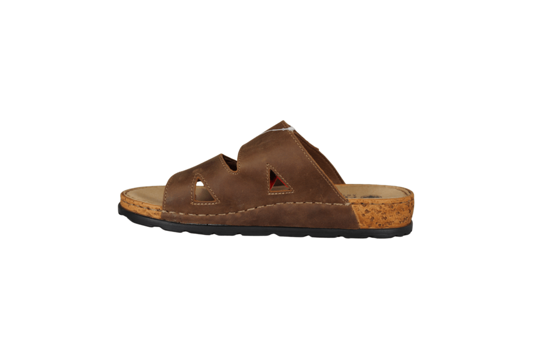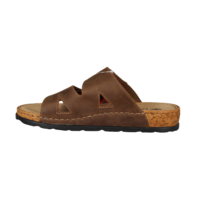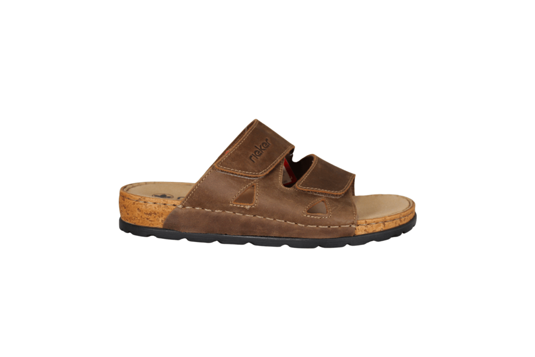 RIEKER 25691-25 BRUN (462-0211). God praktisk sandal med to velcroremme over foden, så den sidder godt på foden. De 2 remme er lavet i skind, så den nemt kan friskes op med læder balsam. Indersålerne er polstret med AntiStress, så sandalen er bløde at gå med. En meget let og fleksibel sandal, som er god til de varme dage eller som hjemmesko inde.