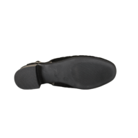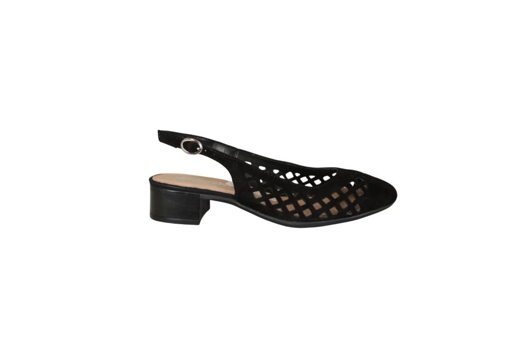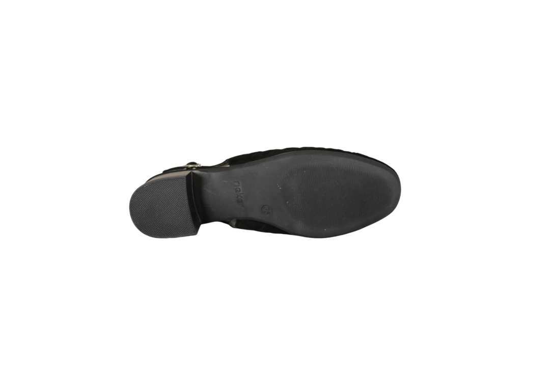RIEKER 43457-00 SORT EXTRA VIDDE (036-665). Flot sort sling back, med firkanter huller i. Kan reguleres ved bagremmen, ved det lille sølv spænde. Lille hæl på ca 3,5 cm. Indersålern er polstret med Rieker Antistress såler, så skoen er god blød at gå med. ydersålerne er en tynd gummi sål. Modellen har ekstra vidde i. Med den lukket tå kappe, kan man kun ane tæerne. En fin sko til daglig brug eller til pænere brug.