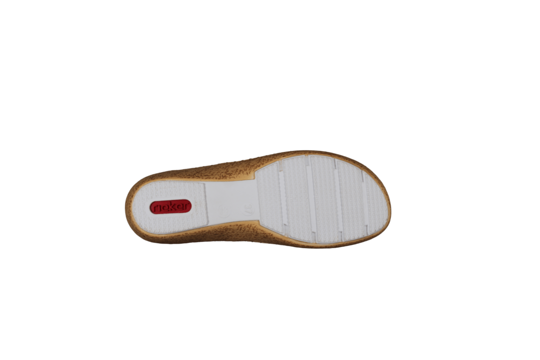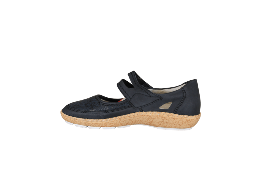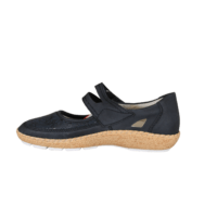 RIEKER 44859-14 (241-1901). Flot blå tullesko med en rem over vristen, som kan regulers med velcro rem. Indersålerne er med polstring, så skoen er blød at gå med. Materialet på forbladet er lavet med strecth, så det tilpasser sig efter foden. Ydersålen er kork ligne pu, samt en hvid sål under. En meget let og fleksibel sko, som er god til daglig brug eller til festerne.