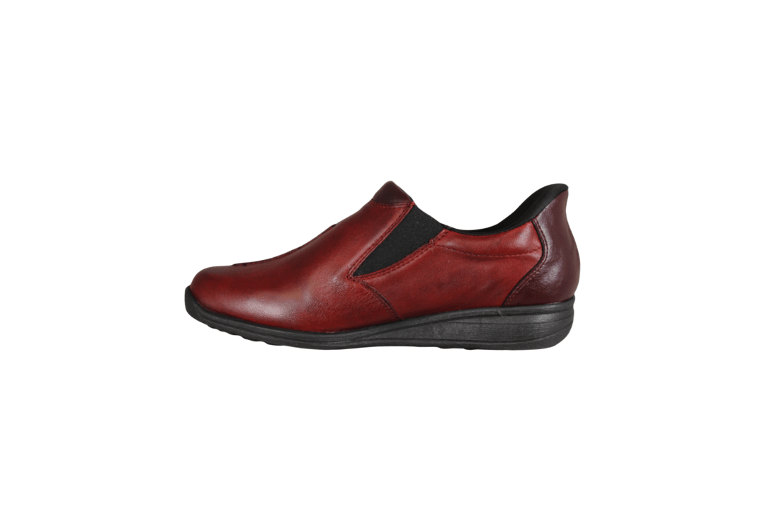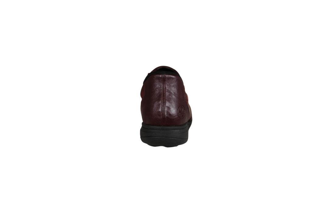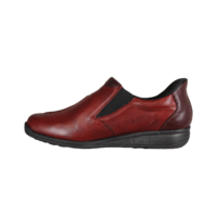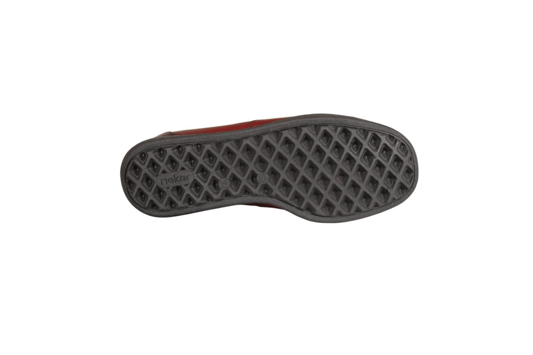 RIEKER 47253-35 RØD (032-816). Flot rød skind Ready 2 Go, så man hopper lige i den, uden brug af finger eller skohorn. Lille hæl på 3 cm. Inder sålen er polstret og formstøbt og kan tages ud af skoen. Ydersålen er en gummisål, så man stå bedre fast. Skoen har ekstra vidde i, så der er god plads i skoen. God til daglig brug eller til festerne.