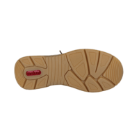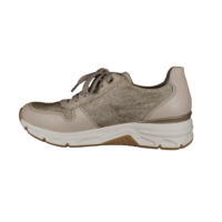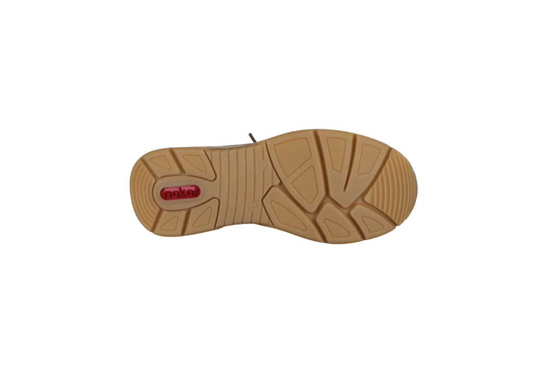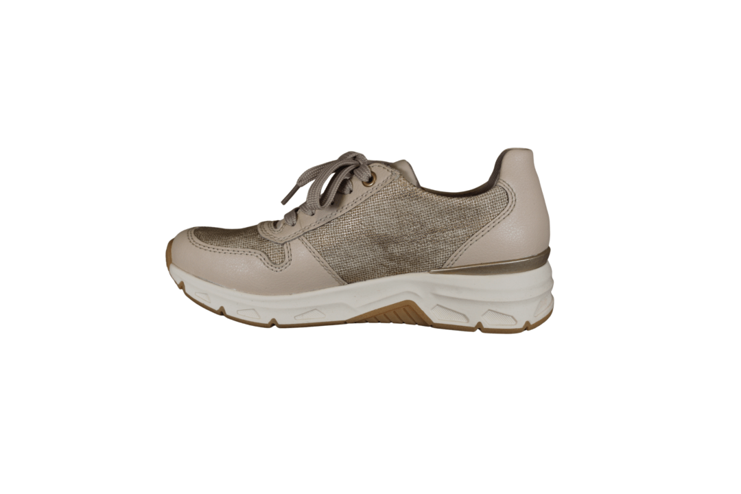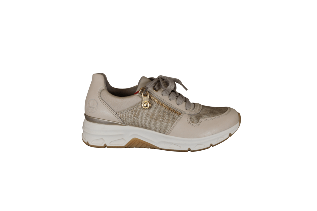 RIEKER 48101-60 BEIGE (032-819). Beige farvet sneakers med guldnitter i over materialet, samt en guld lynlås. Sålen har en kilehæl – hælen er 3,5 cm og forfoden 2 cm. Udvendig materiale er en blanding af skind og vegansk materiale. Indvendig er skoen foret med tekstil – indvendig sål kan tages ud hvis man har behov for sin egen sål.