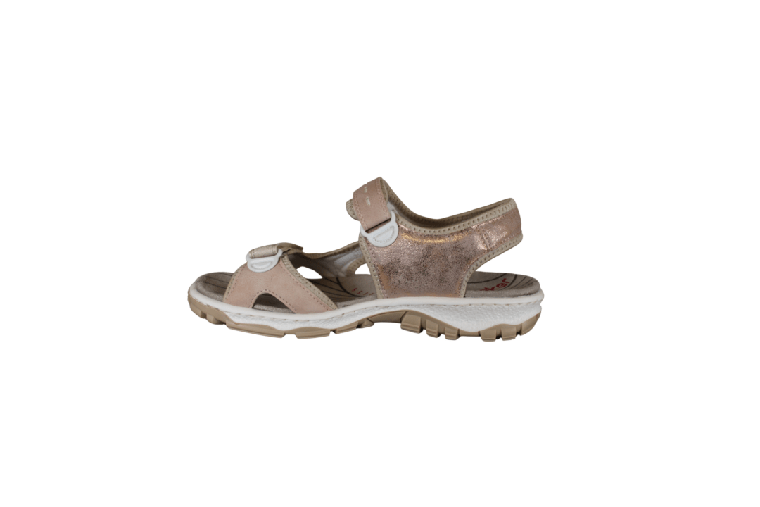 RIEKER 68866-31 ROSA (041-843). Rosa farvet sports sandal med to velcroremme, som kan reguleres til. Foden ligger og hviler i en fodskål, så sandalen sidder god fast på foden. Både ind- og udvendig er materialet vegansk, og inderforingen er tekstil. En god sandal til daglig brug, samt til traveturene.