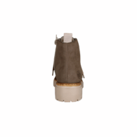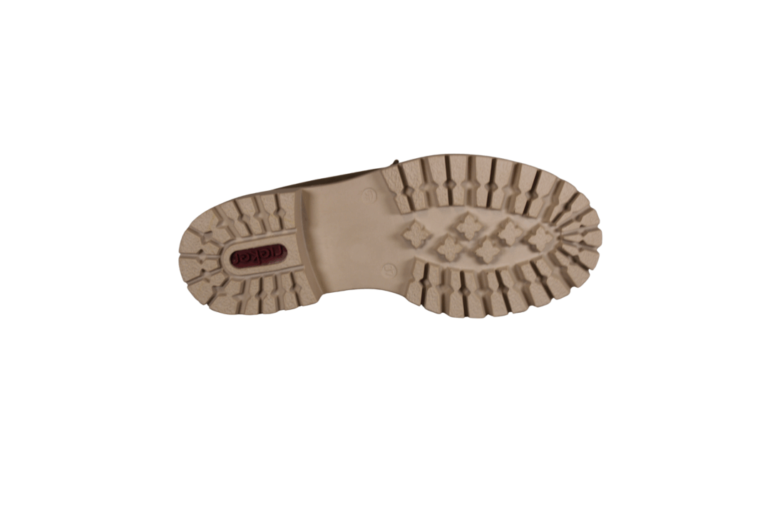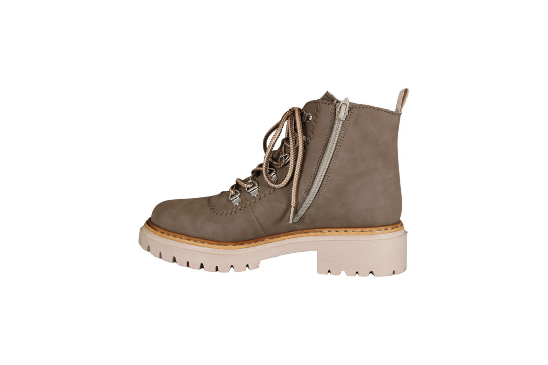 RIEKER 72624-64 BRUN (525-1150). Brun smart kort støvle fra RIEKER med tykt blød tekstil foer indvendig. Støvlen har snørebånd på forbladet, samt lynlås på indvendig side. Materiale er vegansk materiale og tekstil indvendig. Sålen er chunky, hvilket gør støvlen smartere at se på. Rundt i sålen er en brun kant med hvide syninger.