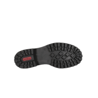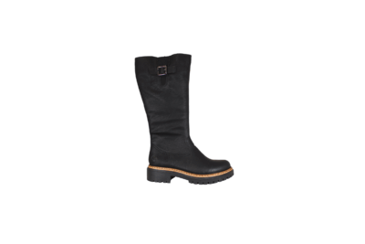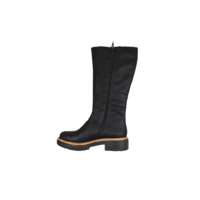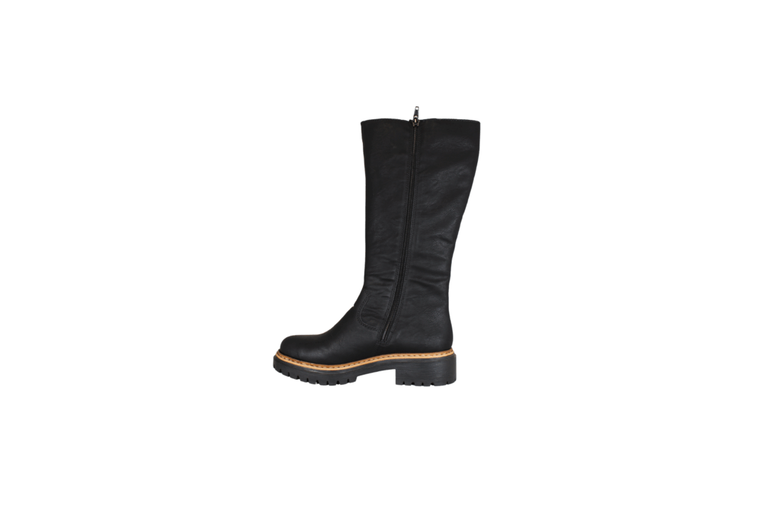 RIEKER 72694-00 SORT (525-1152). Sort lang skaftet kunde med brun kant rundt i sålen. Støvlen er lavet i vegansk materiale, og er foret med blød tekstil foer indvendig. På skaftet af støvlen sidder en pynte spænde, og bagved er der elastik. På indvendig side af støvlen er der en lynlås.
