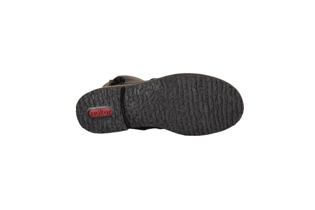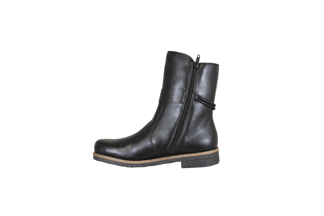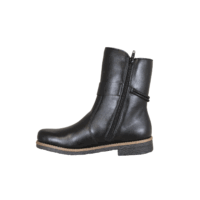 RIEKER 73551-00 SORT (525-1135). Sort 3/4 længde vegansk vinter støvle med en lille rem over ankelen. Inder sålen er polstret, så støvlen er blød at gå med. Lynlås på inder siden, så den er nem at komme i. Rundt i ydersålen er der en brun kant. En rigtig god støvle til daglig brug, og de kolde dage.