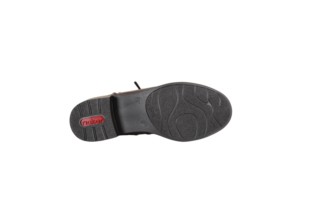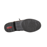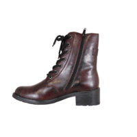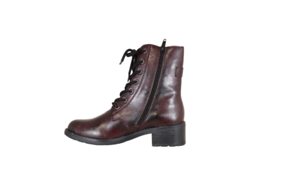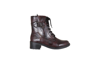 Rieker støvle i mørkerød med let foring. Støvlen har en lynlås på indvendig side, så den er let at tage af op på. Foran og op langs vristen og benet er der snøre, så den kan spændes godt fast til benet. Indlægssålen er en antistress sål, som er blød og behagelig at gå på. Slidsålen er lavet i sort gummi, og har en lille hæl på 5cm.