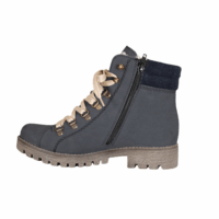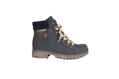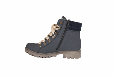 RIEKER 785F8-14 BLÅ (Nr. 054-786). Blå vinterstøvle lavet i vegansk materiale, der sagtens kan holdes pæn og ren. Støvlen har uldfoer indvendig, hvilket giver god varme til de kolde vinterdage. Støvlen har også RIEKER-TEX, hvilket betyder den er vandtæt. Ydersålen har en godt mønster, så man står bedre fast. Nem støvle at justere til foden med snørebånd, og nem at tage på med lynlåsen i siden.