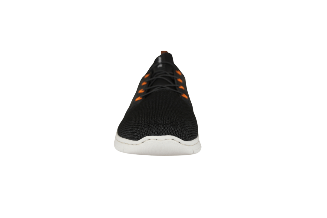 RIEKER B7796-00 SORT (121-0369). Fleksibel herre sko i enkelt sort med let og fleksibel sål. Skoen er lavet i tekstil både ud- og indvendig, hvilket giver en blød fornemmelse til foden. Skoen er sort med orange detaljer, og brun hælkappe. Elastikken snøre hen over vristen, kan være med til den giver sig mere.