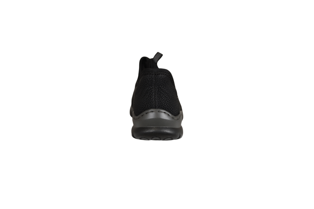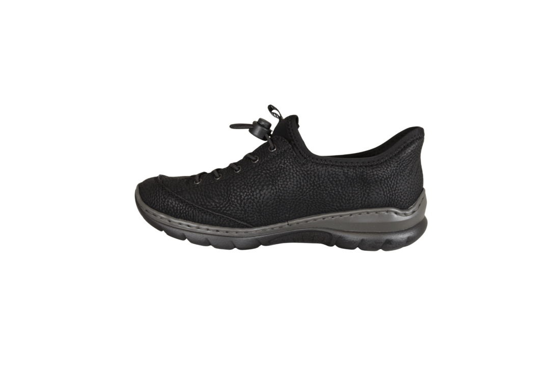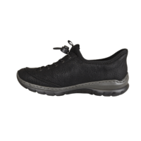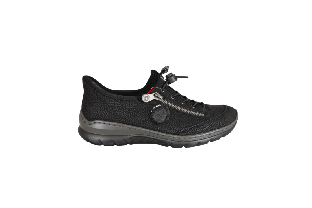 RIEKER L32F1-00 (Nr. 035-008). Sort vegansk sko fra Rieker med elastik snørebånd og pynte sølv lynlås ved siden. Indvendig sål er en memory skum sål, som former og husker dit fodaftryk. God fleksibel sål til både pænere brug og fritid.