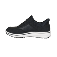 RIEKER L5850-14 BLÅ (032-824). Mørkeblå sneakers med extra wide nede ved forfoden. Skoen er lavet i vegansk og tekstil materiale udvendig. Hen over vristen er der elastik snørebånd, samt bred elastik i begge sider ved åbningen. Indvendig er der en blød og komfortabel indlægssål, som kan tages ud hvis du har behov for din egen.