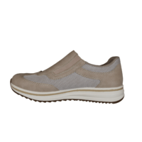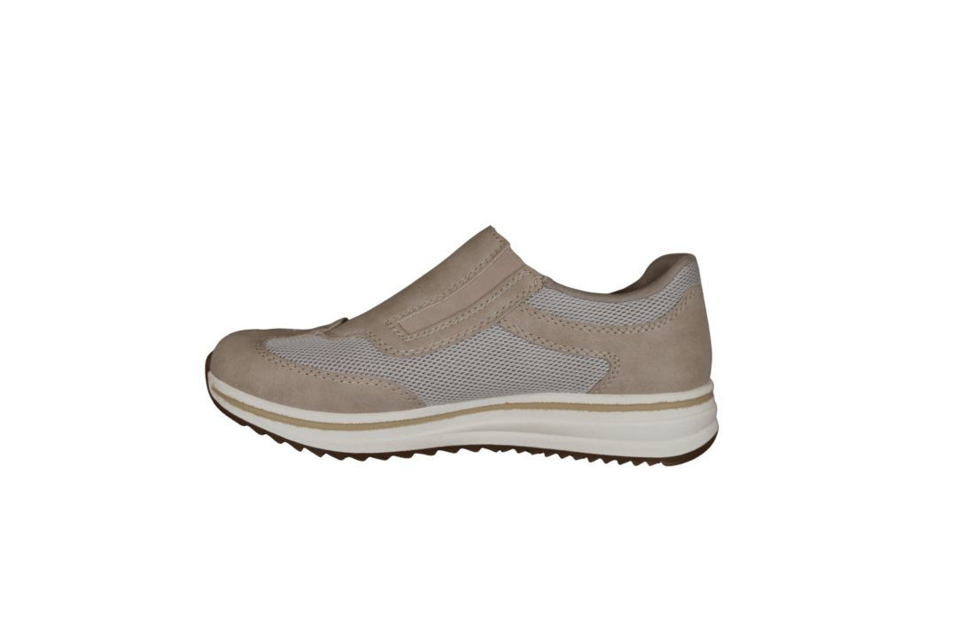 RIEKER L5854-62 BEIGE (032-826). Lys beige sneakers med lynlås i den ene side og elastik i den anden side – så den er nem at smutte ned i. Materialet er vegansk og tekstil udvendig, og foret med tekstil indvendig. Pasformen er EXTRA WIDE. Indlægssålen sidder løst, hvis man har behov for din egen sål. Slidsålen er lavet i gummi.