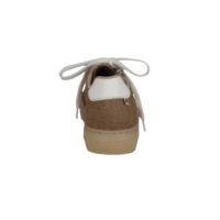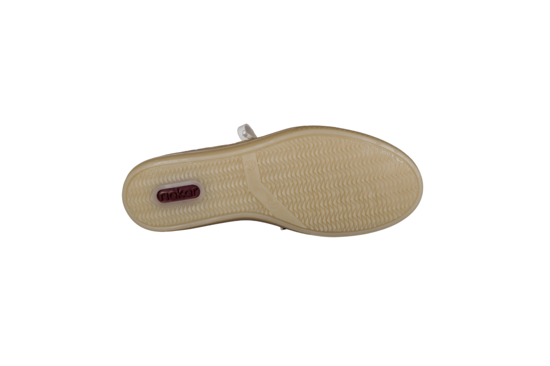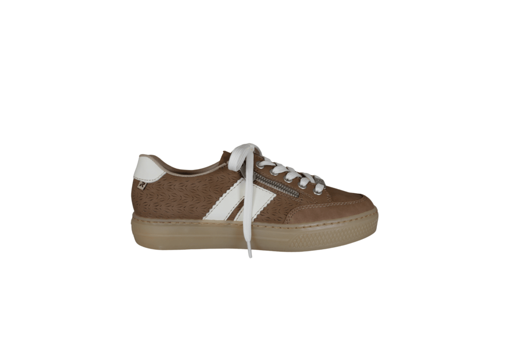 RIEKER L5903-20 BEIGE (032-821). Lys beige sneakers med beige “blomster” mønster. Dejlig nem at justere til foden med både lynlås og snørebånd. Skoen er lavet i vegansk materiale, og skind snude så den er mere slidstærk der. Indvendig er skoen foret med tekstil. Invendig sål er deres bløde SOFT sål, der husker dit fodaftryk.