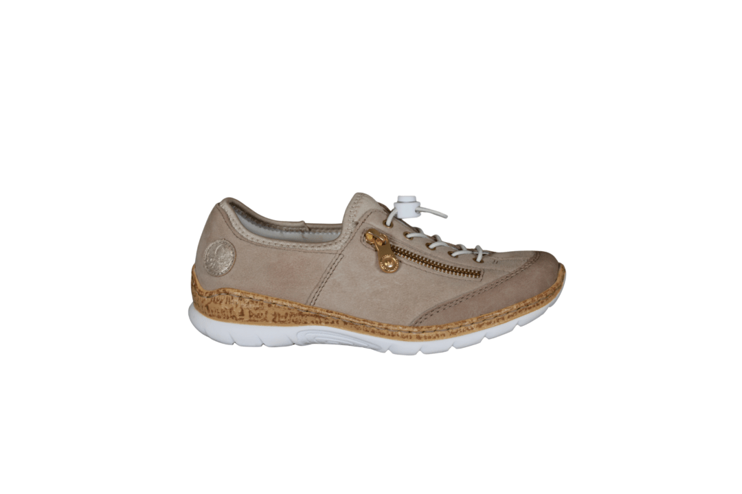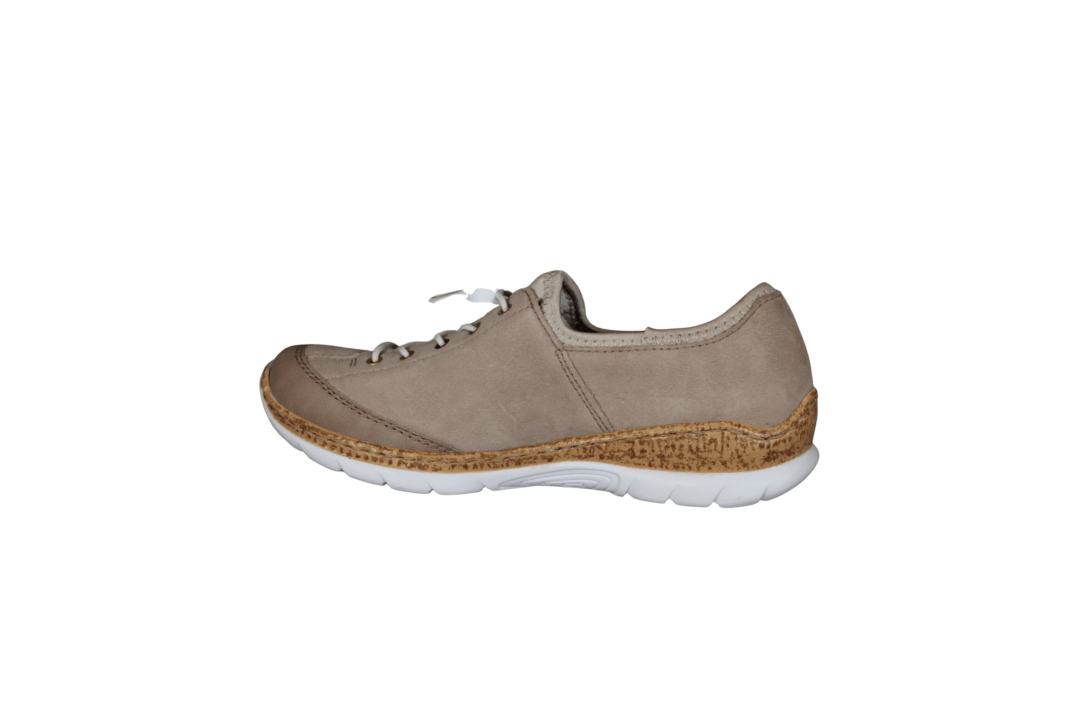 RIEKER N42F1-60 BEIGE (245-0831). Let og fleksibel sok sko, som er nem at komme i. Inder sålerne er med Rieker`s MEMOSOFT såler. Over foden er der elastik snørebånd med en dut til at spænde ud og ind. Mateiralet er en blanding af skind og tekstil materiale.