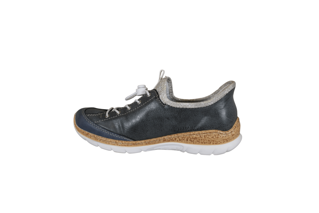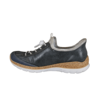 RIEKER N42F2-14 BLÅ (245-0910). Blå vegansk sko fra Rieker med elastik snørebånd og pynte lynlås ved siden. Indvendig sål er en memory skum sål, som former og husker dit fodaftryk. Daglig fleksibel sål til både pænere brug og fritid. Med det nye Ready2GO, hvor man kan tage skoen på uden skohorn, eller brug af finger i hælkappen.