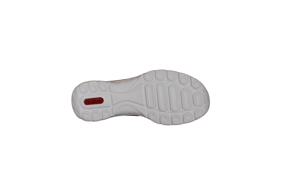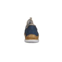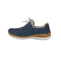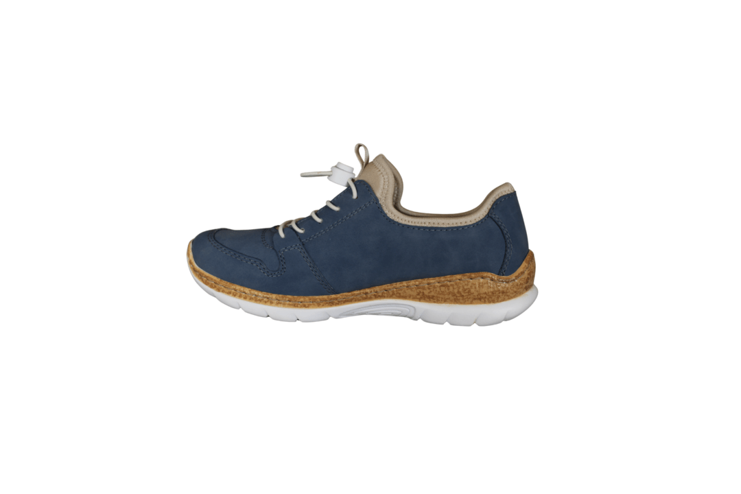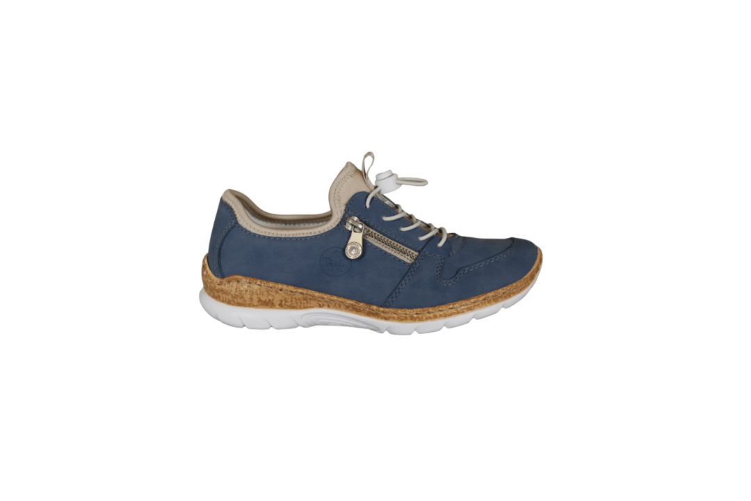 RIEKER N42G0-14 BLÅ (032-818). Lyseblå vegansk sko fra Rieker med elastik snørebånd og pynte lynlås ved siden. Indvendig sål er en memory skum sål, som former og husker dit fodaftryk. Daglig fleksibel sål til både pænere brug og fritid.