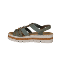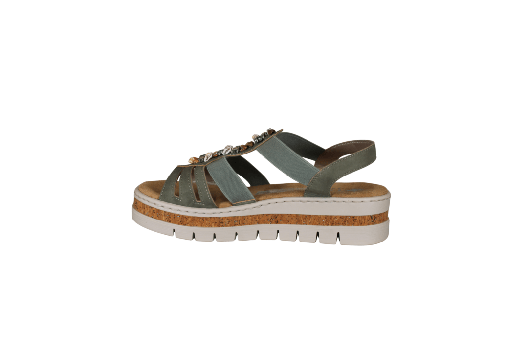 RIEKER V4949-52 (041-858). Flot grøn sandal. Indersålerne er polstret, så sandalen er blød at gå med. Nem at komme ned i, med elastik i sidderne. Sten og små muslinger, samt perler på forbladet. Ydersålerne er med en pu sål og med en kork kant med lidt glimmer i. En let sandal der er god til daglig brug eller til festerne.