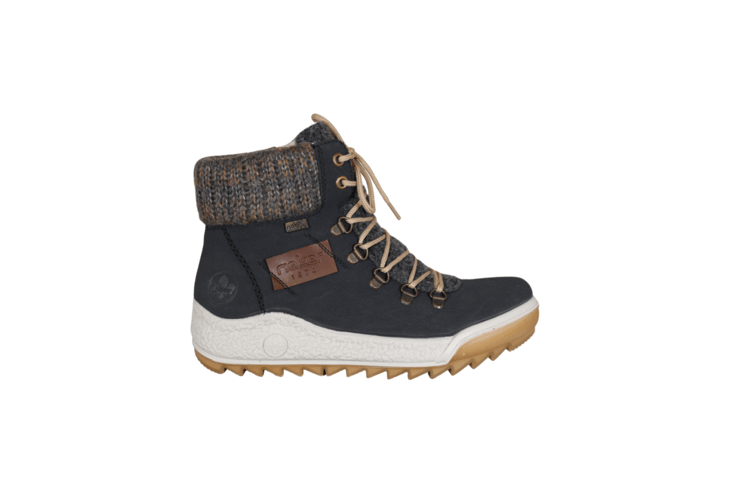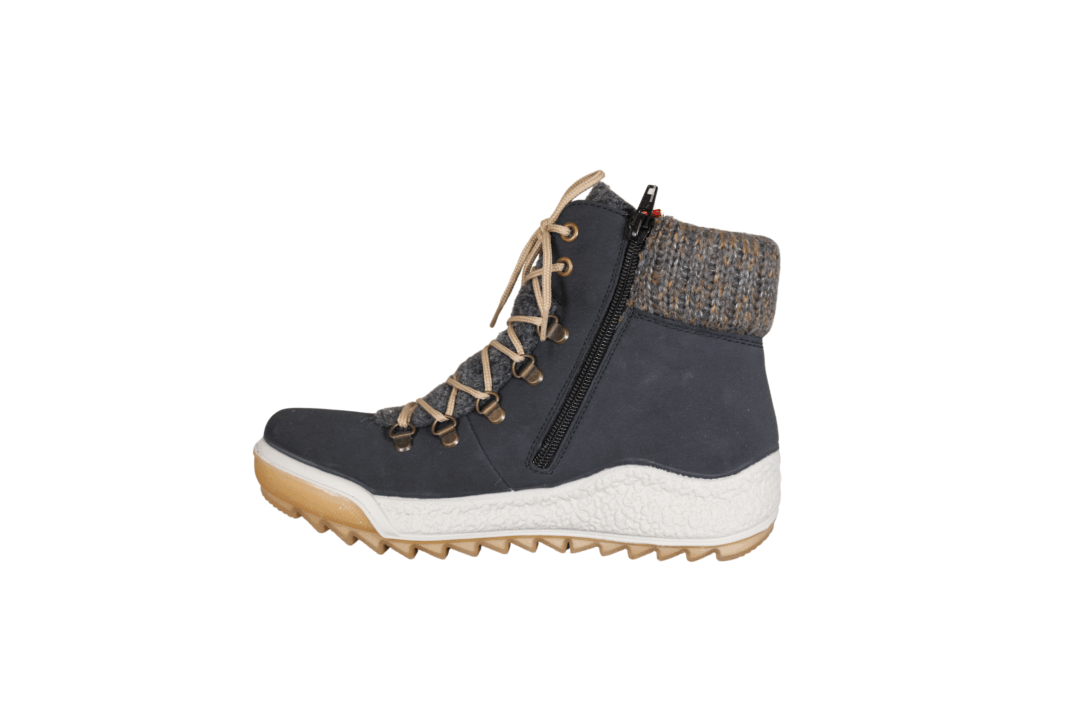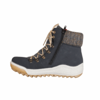 RIEKER Y4730-14 (Nr. 054-744). Blå varm og fleksibel vinterstøvle. Støvlen har både snørebånd og lynlås, så den kan tilpasses foden og nem at tage på og af. Støvlen har RIEKER-TEX, hvilket gør den vandtæt. Udvendig er støvlen lavet af vegansk materiale. Indvendig er det lamme uld, hvilket giver en god varme. Sålerne har et godt mønster, så man kan stå fast. eN God støvle til de kolde dage.