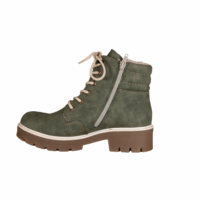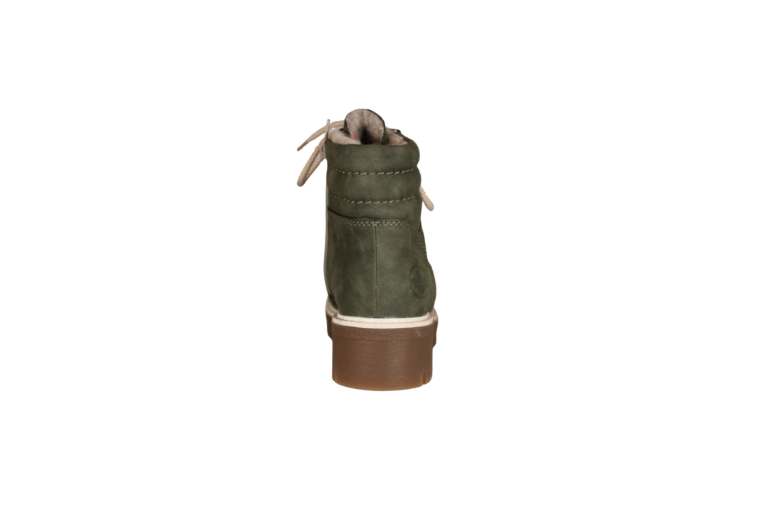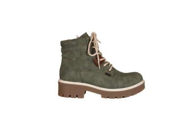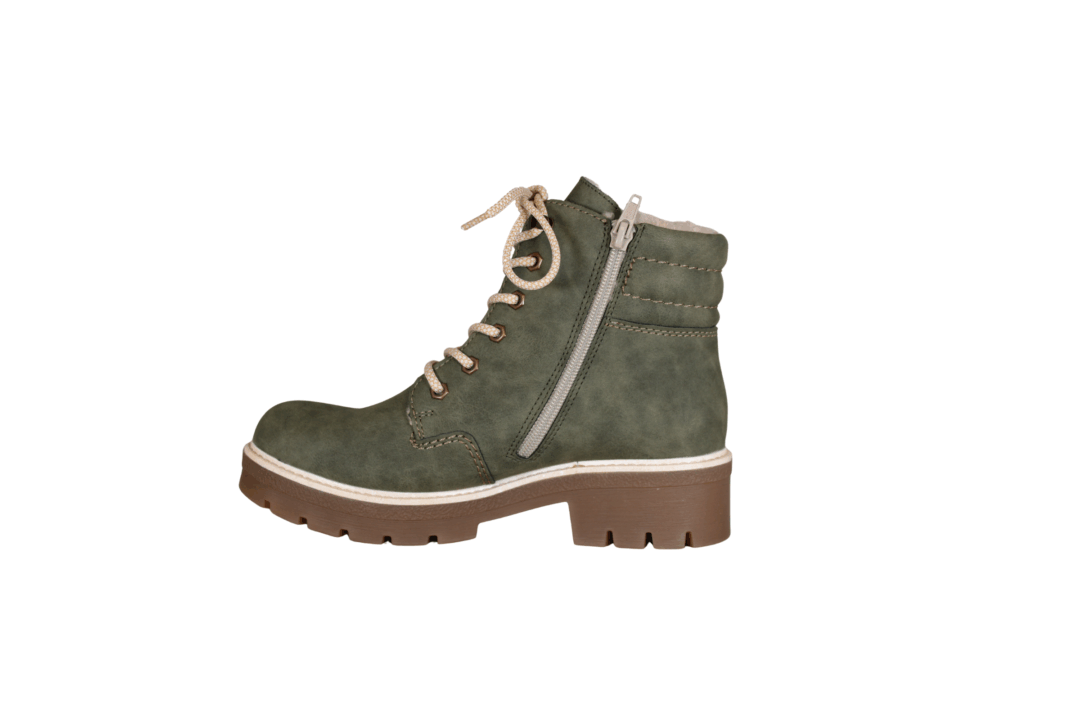 RIEKER Y8120-54 GRØN (525-1138). Grøn kortskaftet vinterstøvle med både lynlås og snørebånd. Støvlen er lavet i vegansk materiale udvendig, og foret med tekstil. Sålen er en god kraftig sål til de kolde vintre. Støvlen har RIEKER-TEX, hvilket betyder den er kraftig vandafvisende.