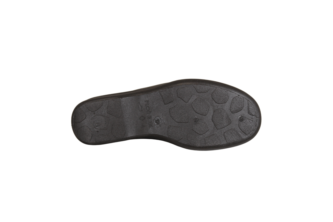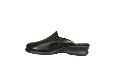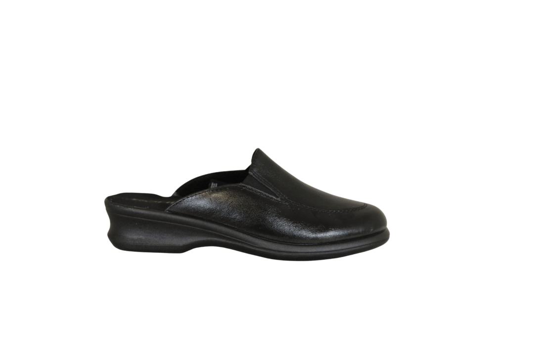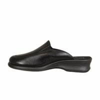Rigtig fin skind hjemmesko uden kappe til damerne. På begge sider ved vristen er der et lille stykke elastik, så den kan give sig en smule. Hjemmeskoen har en hæl som er 4cm høj. Sålen er lavet af sort pvc.