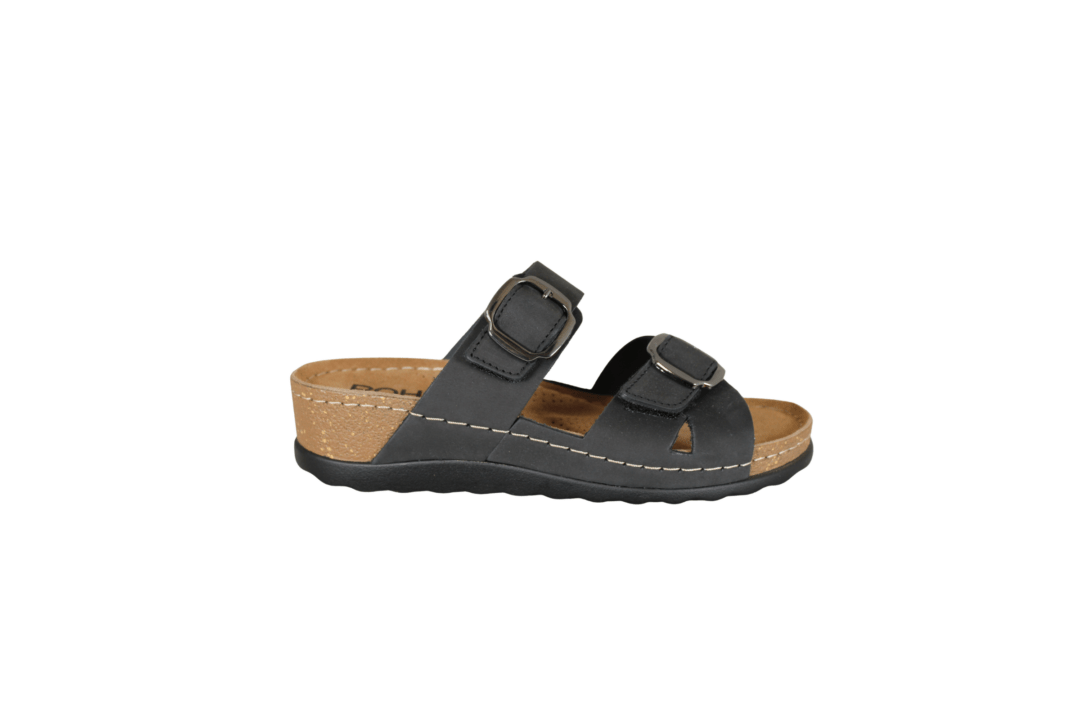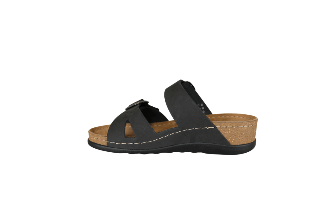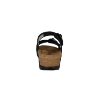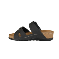 ROHDE 5430-90 SORT (442-1685). Flot Rohde sandal med en lille kilehæl på ca 4,5 cm. Indersålerne er polstret og er i skind, så sandalen er god blød at gå med. Under de 2 guld spænder er der velcro rem, så man kan regulere remmene, så de passer foden. En flot sort farve i nubuck med mørke sølv spænder, som passer til det meste i garderoben, kan bruges som hjemmesko eller sandal.