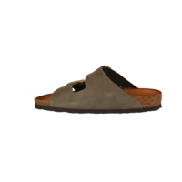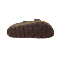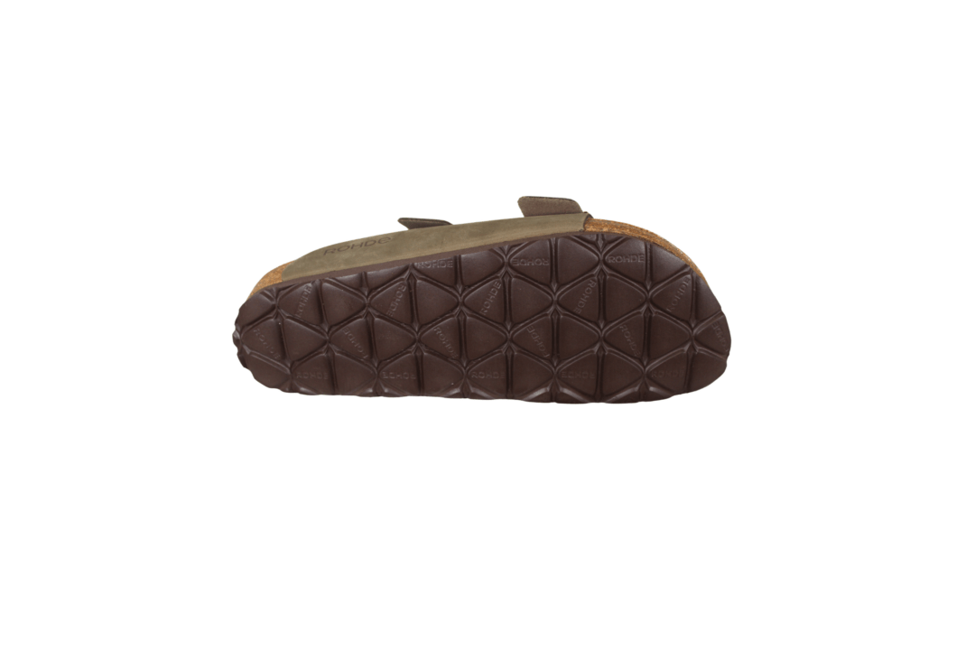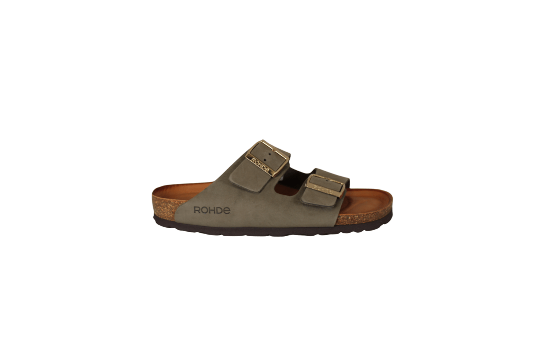 ROHDE 5650-61 OLIVE (442-1689). Oliven grøn let og fleksibel slippers. Kan reguleres i de 2 spænder. Sandalen har en fodskål, hvor de foden ligger i. Sandalen er lavet i skind både ind- og udvendig. Udvendig er sandalen i nubuck, og dæksålen er glat skind. Hælen er ca 2 cm, dog lidt laverer pga af fodskålen. God til både hjemmesko eller sommersandal.