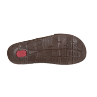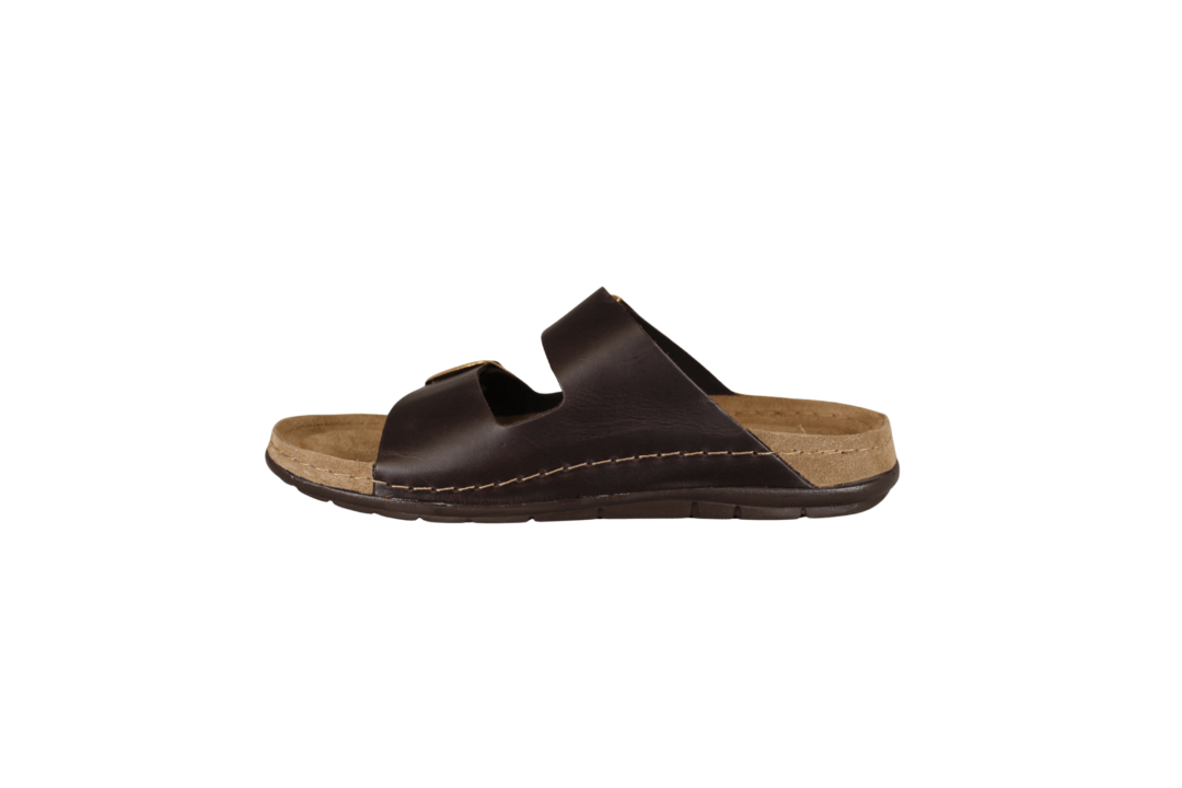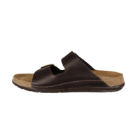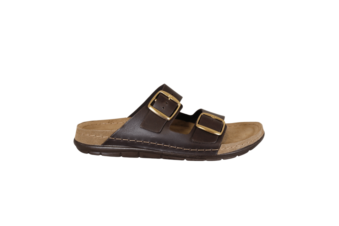 ROHDE 5865-71 ESPRESSO (442-1679). Flot skind tøffel i en flot mørkebrun farve med store guld spænder. Sandalen er skinde både ind- og udvendig. Sålen er en god stødabsorberende sål. Meget let og fleksibel sandal, med fodskål og bløde såler. God til daglig brug, hjemmesko eller som en sandal.