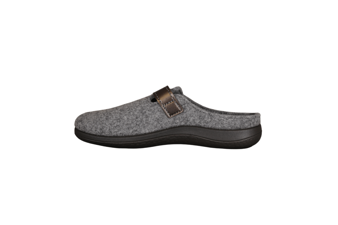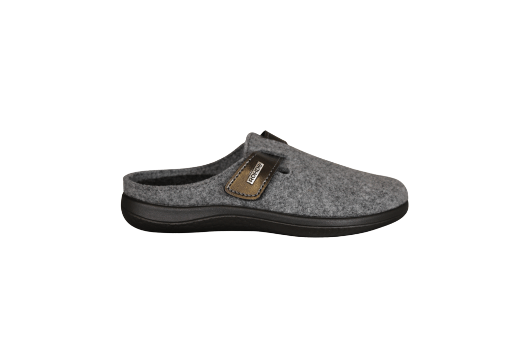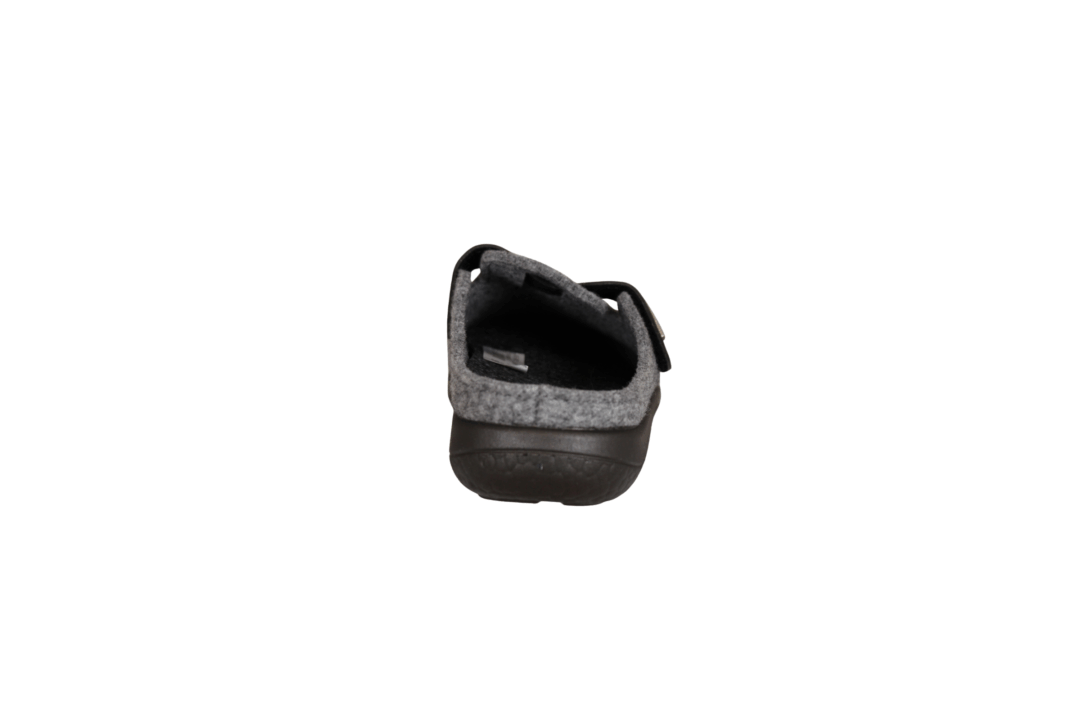 ROHDE 6549 (057-662). Grå filt hjemmesko med metal rem, som kan reguleres. Indersålen er polstret og kan tages ud, gør hjemmeskoen dejlig blød at gå med. En meget let og fleksibel hjemmesko, god til timerne i hjemmet.