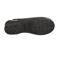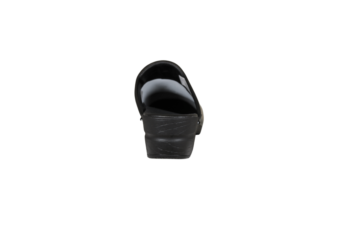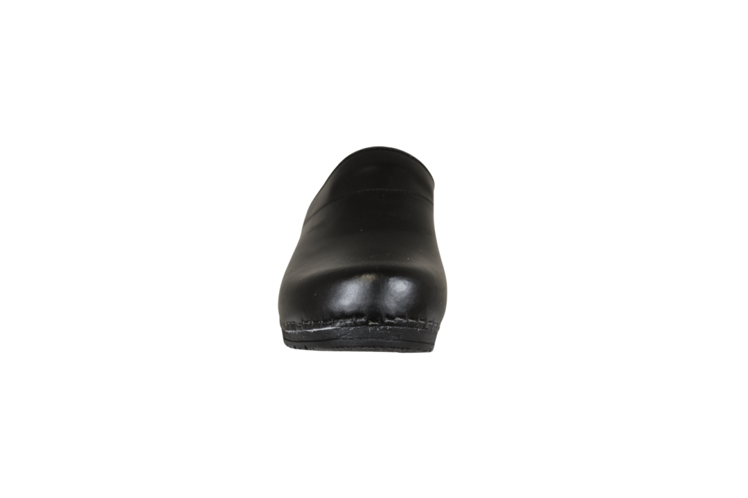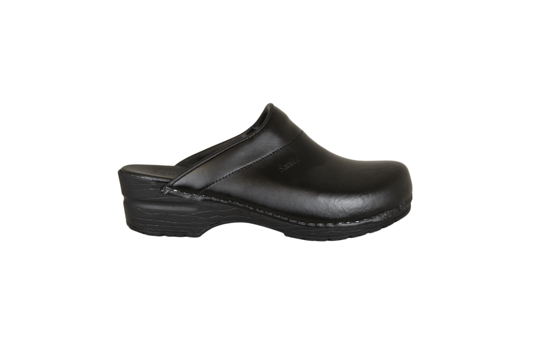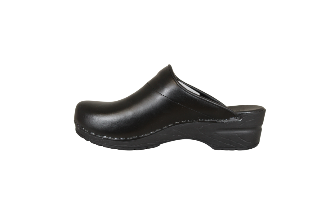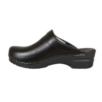 SANITA KARL 1500050 (Nr. 824-3). Sort træsko uden hælkappe med bløde gummi såler. Overstykket er overtrukket skind. Sålerne er polsteret, og med lædersåler. Gode til havebrug eller hverdag.