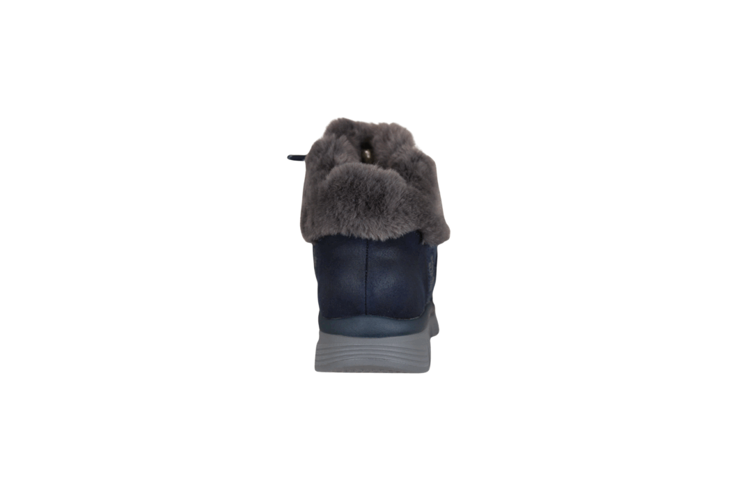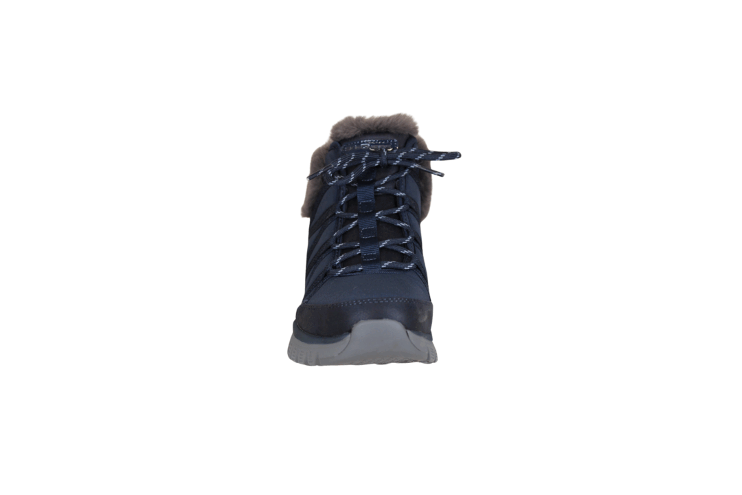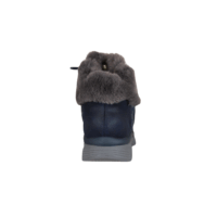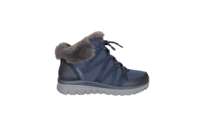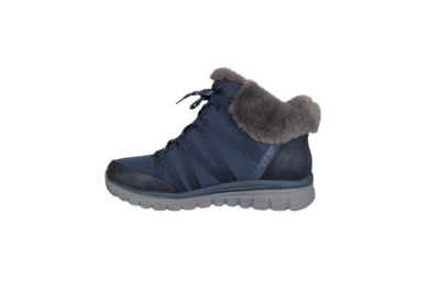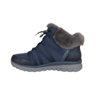 SKECHERS 168100/NVY COZY STROLLS (525-1134). Blå vinterstøvle lavet i tekstil udvendig. Indvendig foring er tyk blød tekstil foer. Sålen er den velkendte bløde sål at gå på. Hælkappen er SLIP-INS hvilket betyder du nemt kan smutte ned i støvlen. Støvlen kan også justeres til foden med snørebånd. Slidsålen har anti-slip til de glatte vinterdage.
