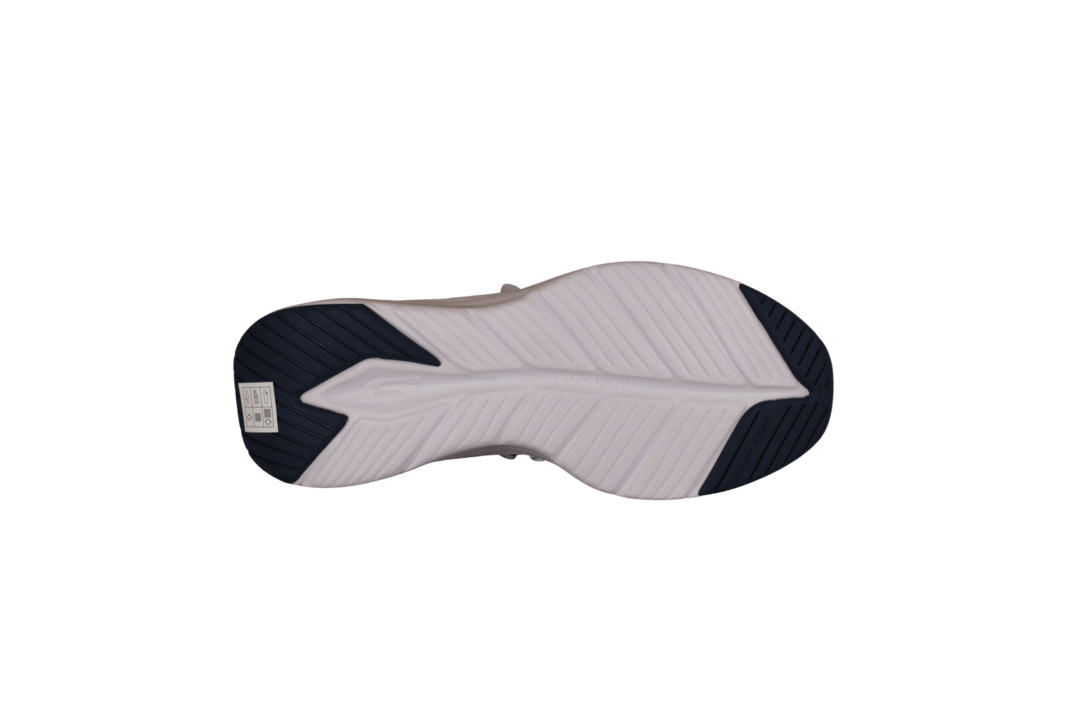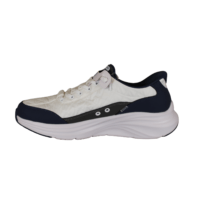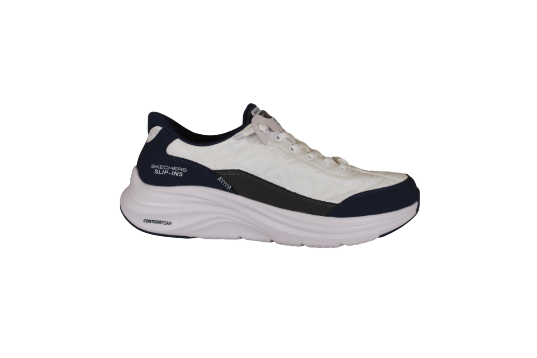 SKECHERS 232619/WNV COZY FIT (741-3756). Hvid sneakers med mørkeblå og grå detaljer rundt på skoen. Skoen har elastik snørebånd og SLIP-INS hælen, så man nem kan smutte ned i skoen. Materialet er tekstil og vegansk udvendig, og foret med tekstil indvendig. Det vegansk materiale har ternet mønster.
