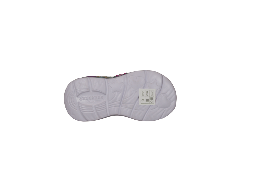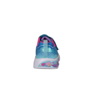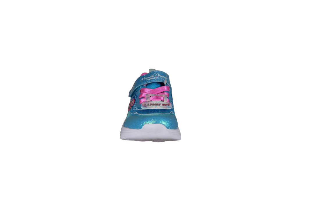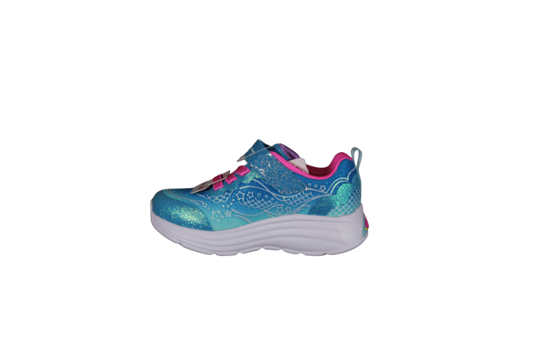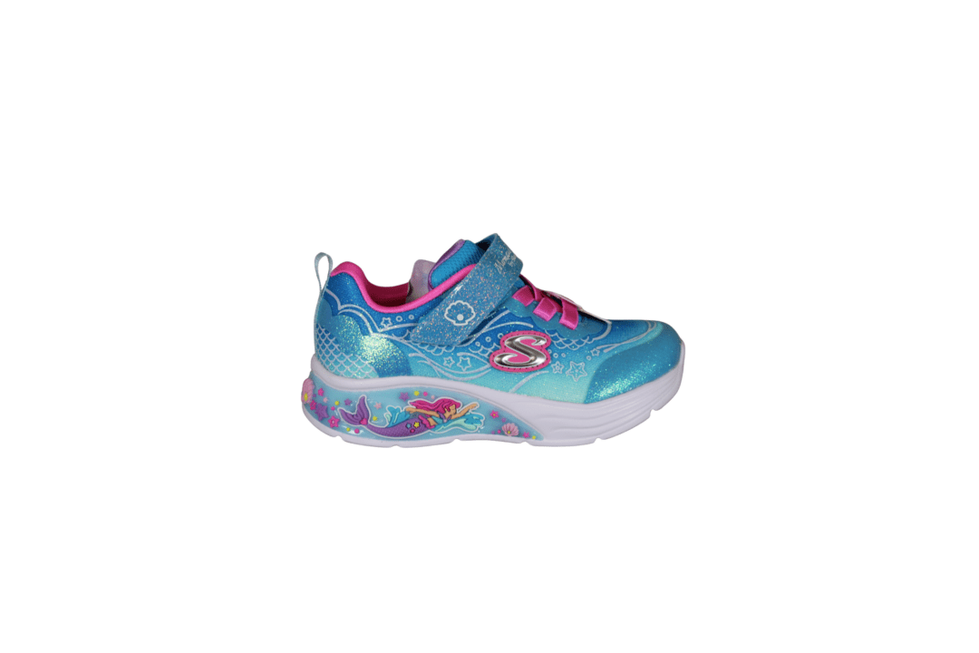 SKECHERS 303061N/BLMT LIL MERMAID (741-3737). Sød blå multi glimmer kondisko til de små piger. Sålerne er der lys i og den lille havfrue på siden, Mermaid Dreams. Nem at hoppe i med velcro rem og elastik snørebånd. En meget let og fleksibel sko, pigerne vil elske.