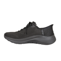 Super smart sneakers fra Skechers til damer. Skoen er lavet af tekstil i helt sort. Foran er der snøre, som kan reguleres. Indvendigt er skoen foret med hvid/blåtekstil og har en Air-Cooled Memory Foam dæksål. Slidsålen er en hvid EVA sål med blå nister. Den model er forstærket i hælkappen, så den er lige til at smutte i uden brug af skohorn. Modellen kaldes også Hands Free Slip-ins. Super smart sko til både fritid og arbejde.