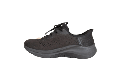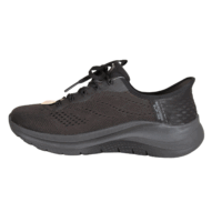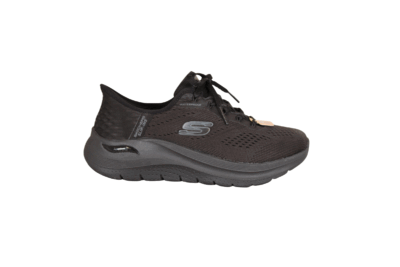 Super smart sneakers fra Skechers til damer. Skoen er lavet af tekstil i sort og med sorte såler. Foran er der snøre, som kan reguleres. Indvendig er skoen foret med tekstil og har en Air-Cooled Memory Foam dæksål. Slidsålen er en EVA sål. Den model er forstærket i hælkappen, så den er lige til at smutte i uden brug af skohorn. Modellen kaldes også Hands Free Slip-ins. Super smart sko til både fritid og arbejde. Denne model er 100% vandtæt.