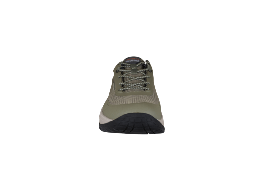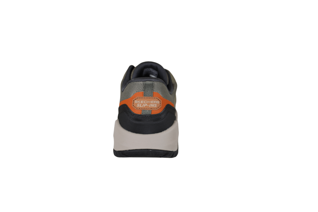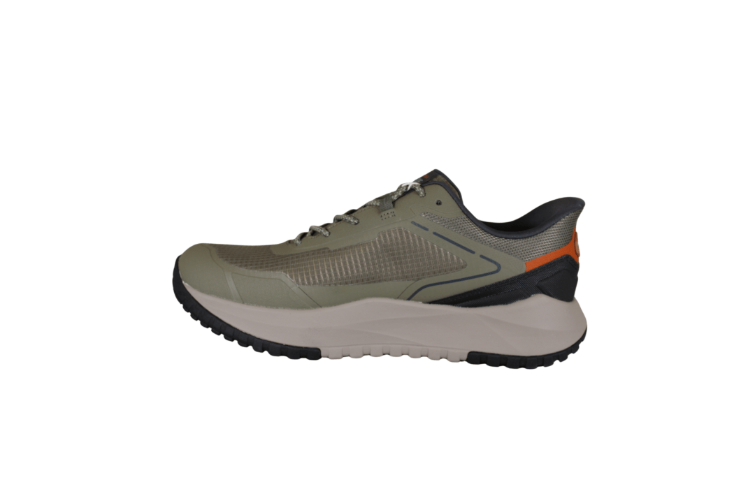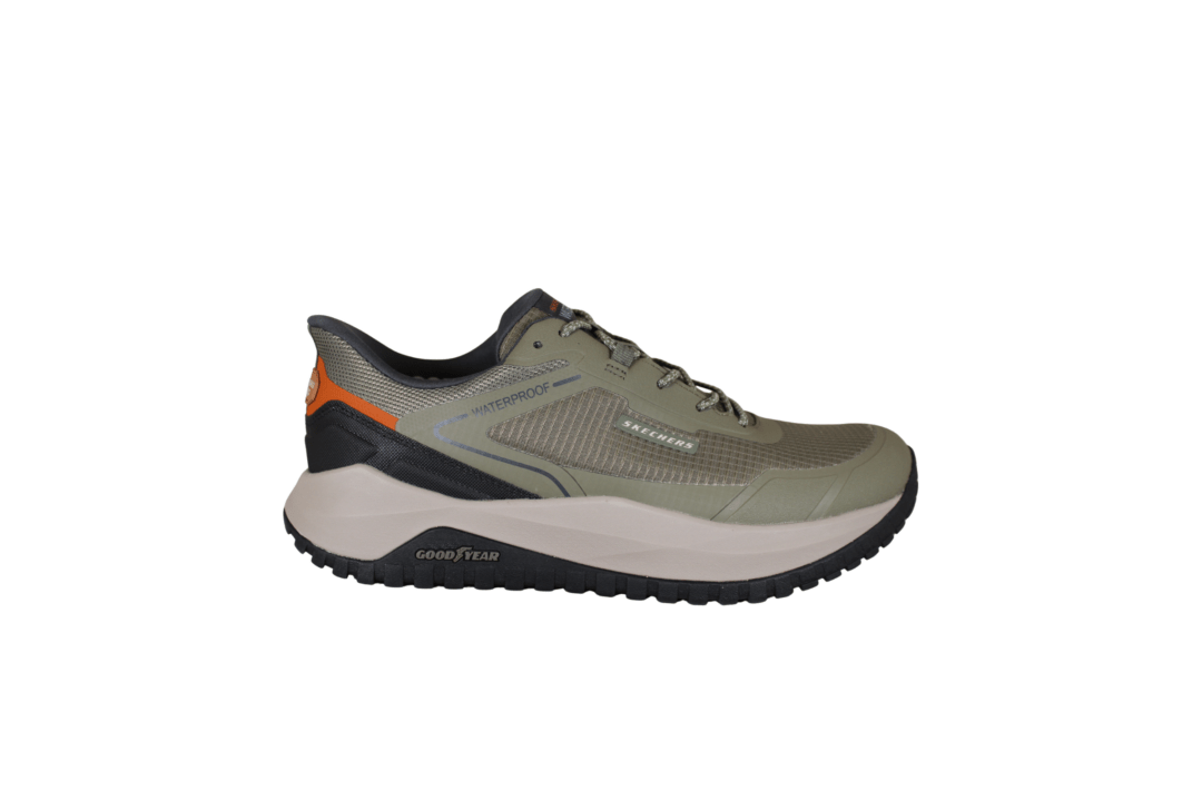 SKECHERS BADGER-KODA 211367/OLV (741-3682). Oliven grøn sneakers med grovere slidsål, der kan tåle mere slid og bruges i grovere terræn. Hælkappen er den populære SLIP-INS hæl. Skoen er lavet i tekstil både ind- og udvendig. Hen over vristen er der elastik snørebånd. Skoen har WATERPROOF, hvilket betyder den er vandtæt.