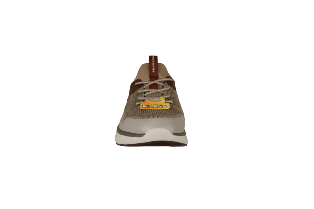 SKECHERS EMERIC 205340/TPBR (741-3752). Helt enkelt taupe/brun Slip-Ins model, så du skal ikke bruge skohorn for at komme i skoen. Modellen er med ArchFit såler, så der god støtte i sålerne. Indersålerne er med Air-Cooled såler, så de er gode bløde at gå med. Ydersålerne er der forstækning i tåen, samt i hælen. En let og fleksibel sko, god til daglig brug, eller til traveturene.