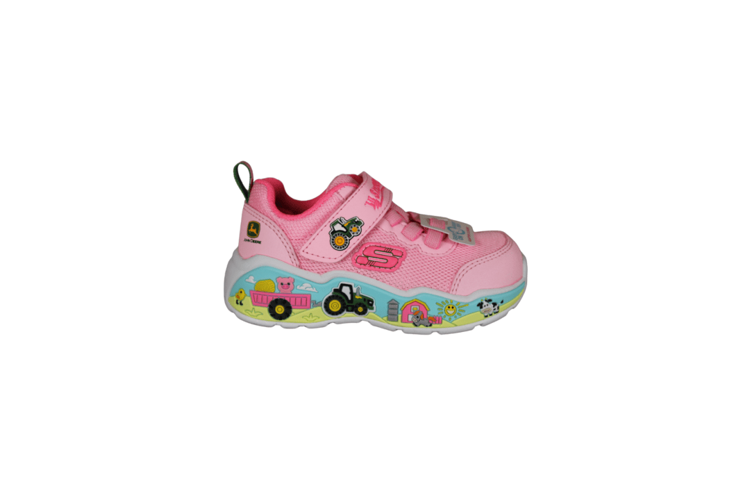 SKECHERS FARM GIRLIE 407065N/GNBK PINK/MULTI (741-3708). Smart kondisko til de små JOHN DEERE elskere. På sålen er der traktor med vogn + hus. Nem for barnet selv at tage på ved hjælp af velcrobåndet.