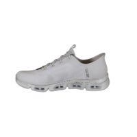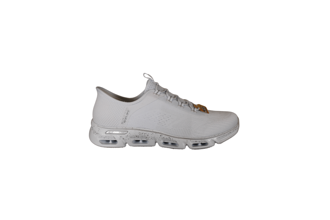 SKECHERS GLIDE-STEP GRATIFY 104610/WHT (741-3732). Hvid klassisk sneakers fra SKECHERS med sølv detaljer rundt på skoen. Hælkappen er den populære SLIP-INS – dejlig nemt at trække ned i. Hen over foden er der elastik snørebånd, der ikke kan justeres. I sålen er der luft huller, som gør at du får ekstra stødabsorbering. Smart og pyntelig til hverdagen.