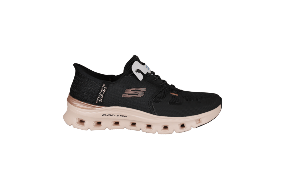 SKECHERS GLIDE STEP PRO 150438/BKRG (741-3634). Smart vegansk sort Slip-Ins med rosa detaljer og elastik snørebånd. Inder sålerner er med Air-Cooled Memory Foam såler, så de er gode bløde at gå med. Glide Step er mellemsålen med stødabsorbering. Nem at hoppe i med Slip-Ins. Kan vaskes på lave grader i maskinen, derefter lufttørres. En god sko til daglig brug eller til traveturene. Meget let og fleksibel.