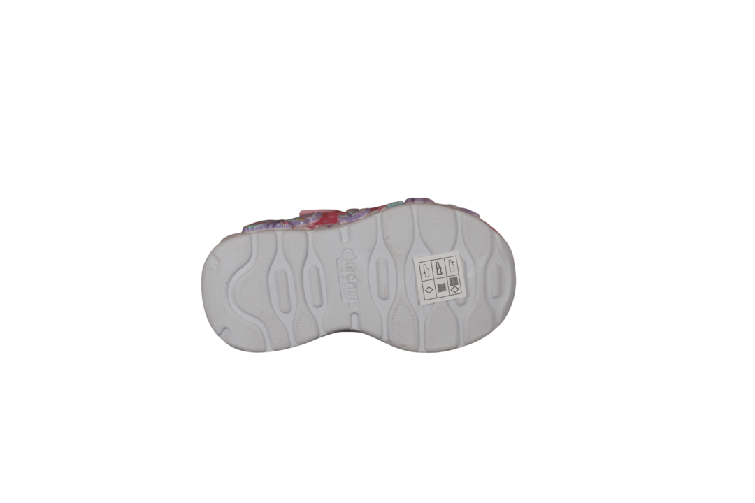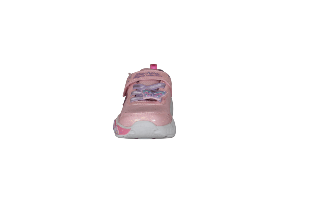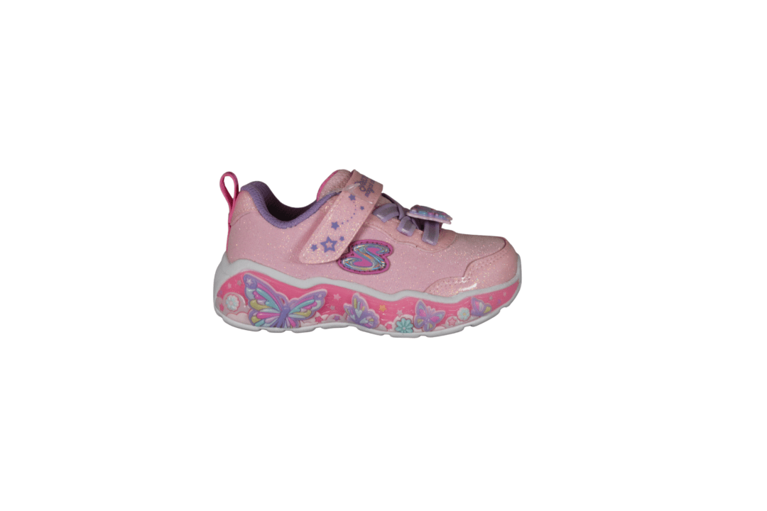 SKECHERS LIL BUTTERFLY BLISS 303066N/LPMT (741-3730). Rigtig fin rosa pige kondisko med glimmer. Med sommerfugle på sålerne og på elastik snørebåndet. Lys i hælen, som blinker, når man går. Nem at komme i, med et velcro rem og elastik snørebånd.