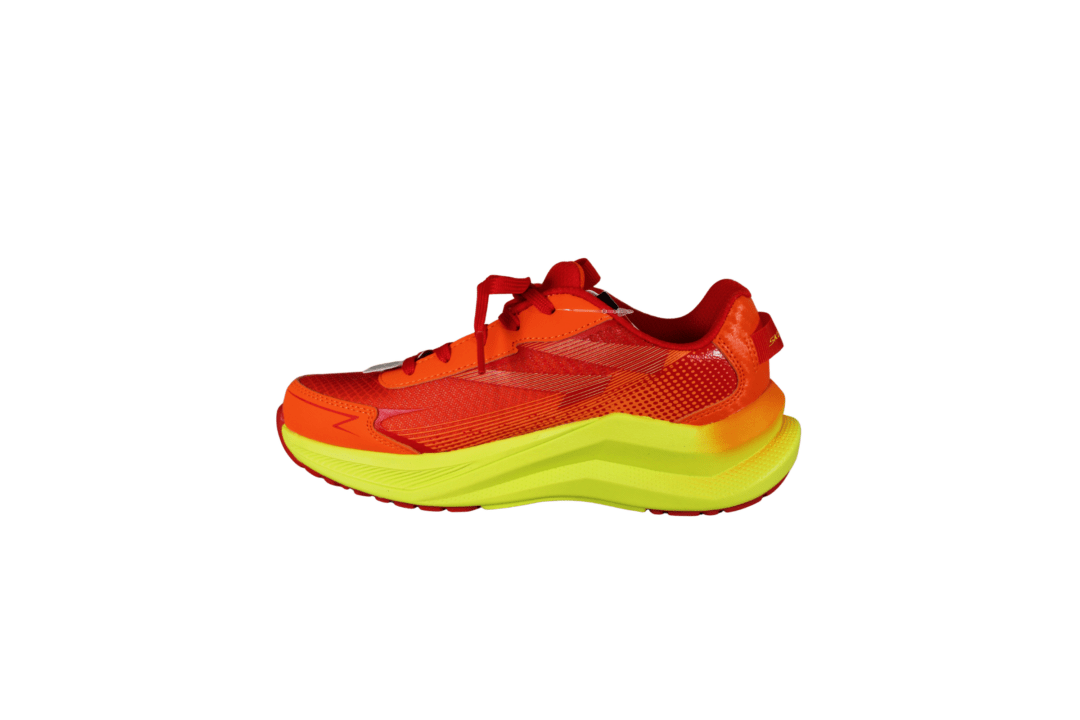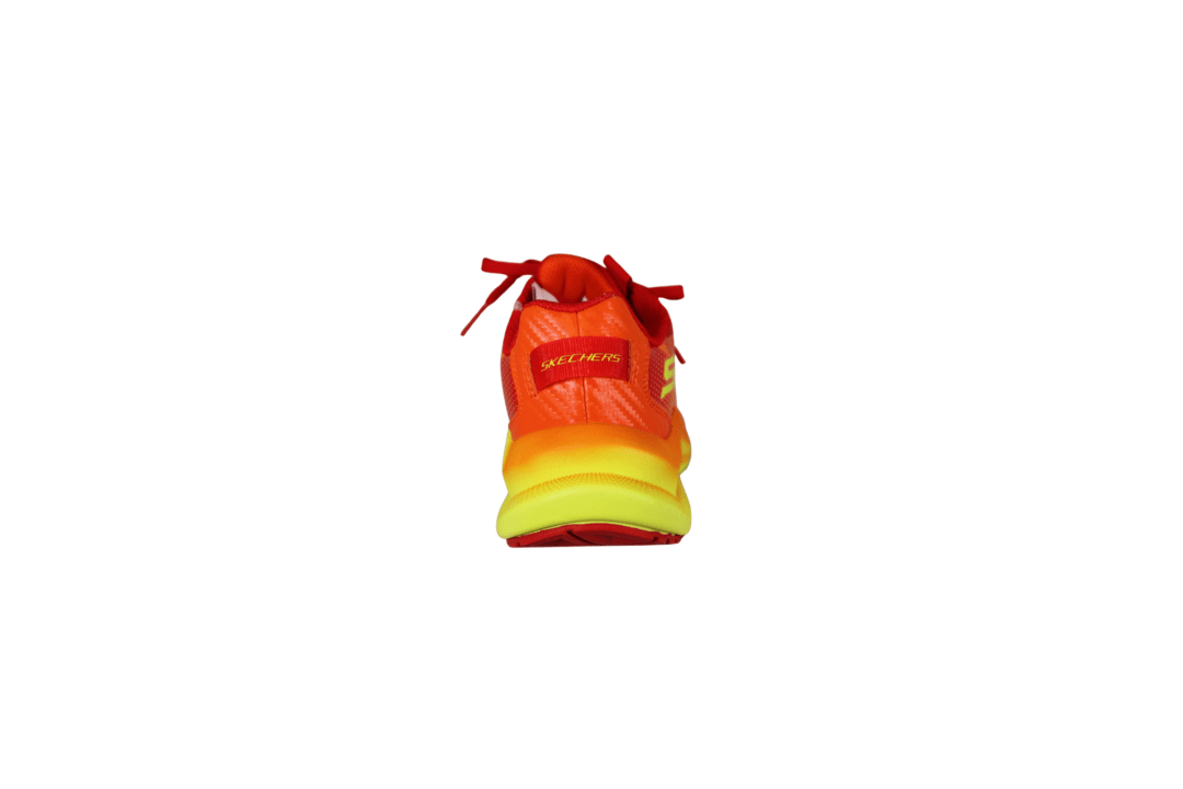SKECHERS MAX CUSHIONING ASCENDER 404023L/ORMT (741-3715). Orange sneakers med røde og gule detaljer rundt på skoen. Materiale er vegansk og tekstil udvendig, og foret med tekstil indvendig. Ydersålen er den gode max cushioning model med god stødabsorbering. Skoen kan tåle vaskemaskine på et skåne program – INGEN tørretumbler.