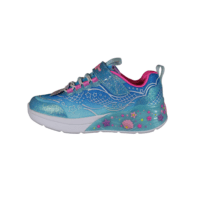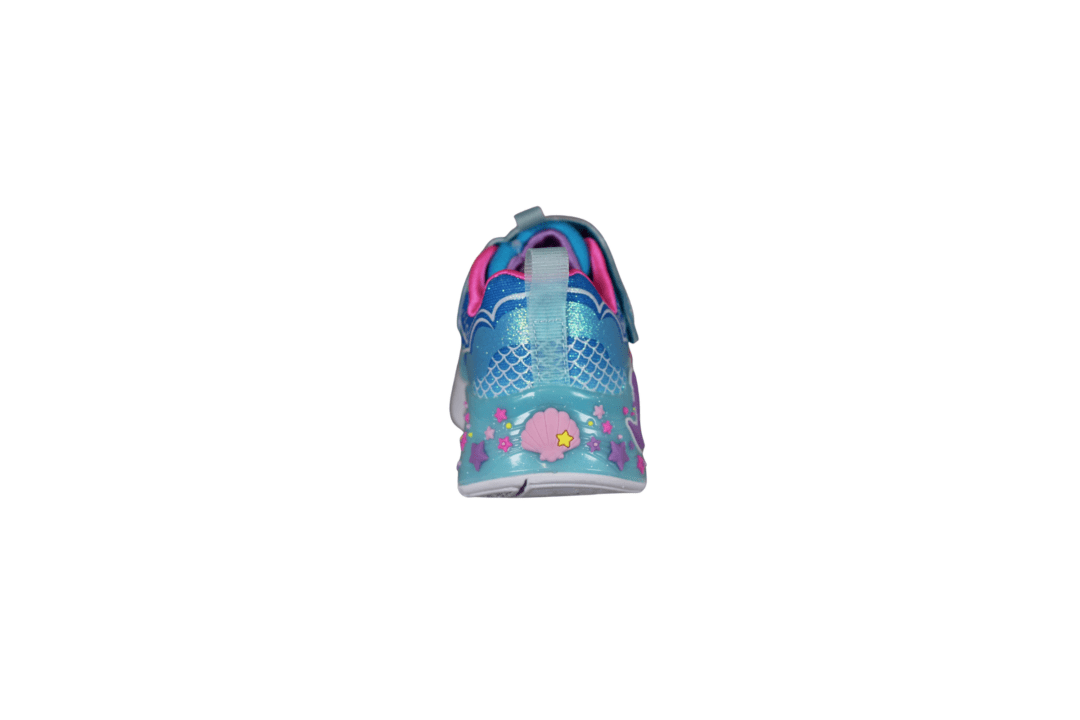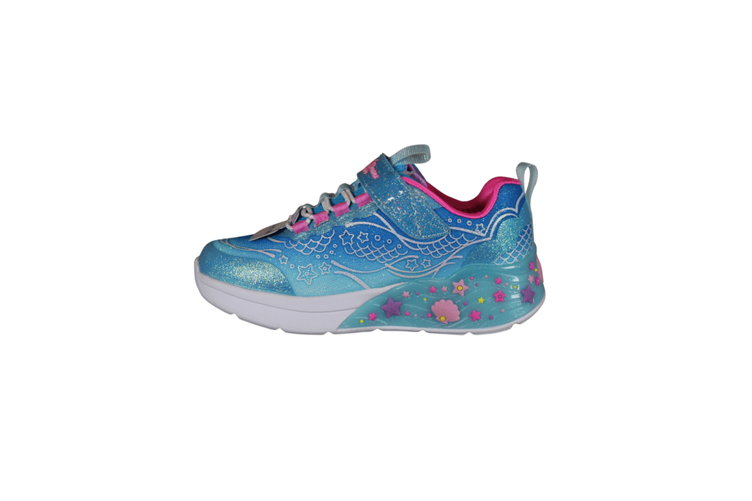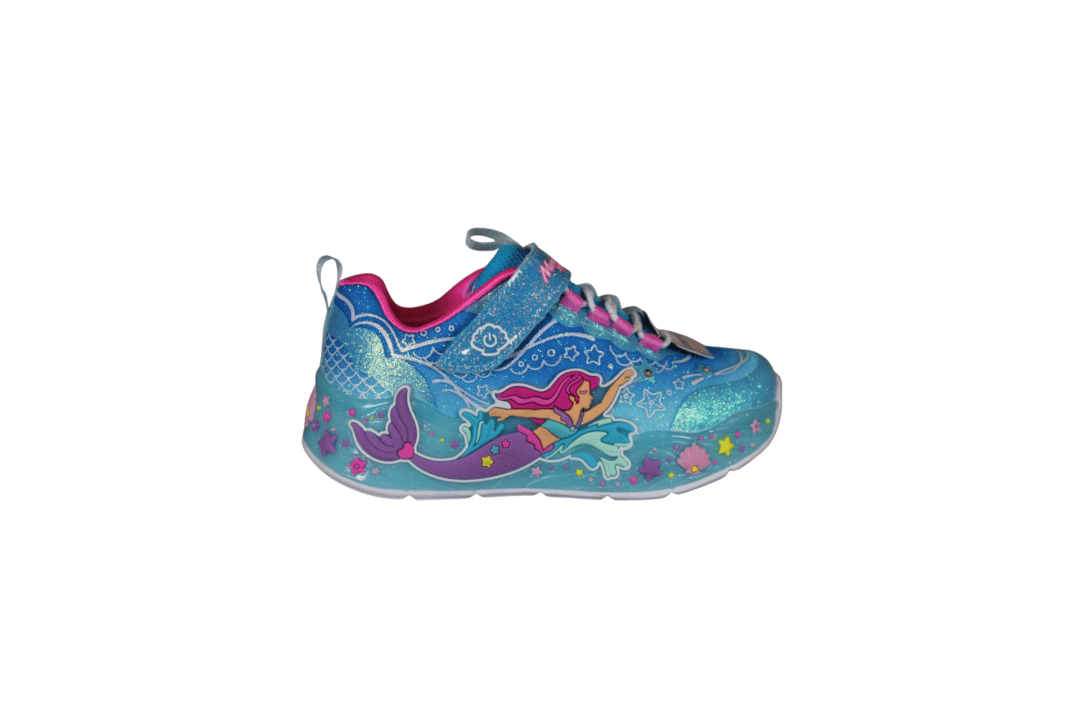 SKECHERS MERMAID DREAMS 303060L/BLMT S-LIGHTS (741-3738). Blinke sko fra SKECHERS med havfrue tema. Skoen er lavet i vegansk og tekstil udvendig, og foret med tekstil indvendig. Hen over vristen er der et velcrobånd med ON/OFF knap. På sålen er der en havfrue med muslinger og stjerner.