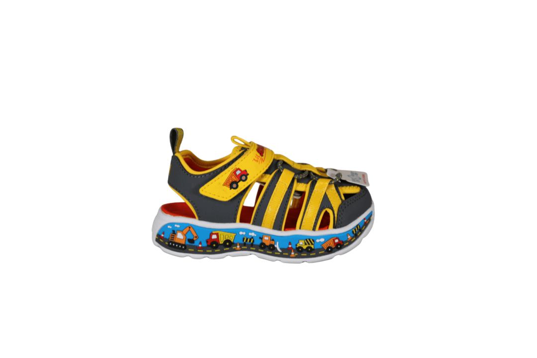 SKECHERS PLAY SCENE SPLASH 407041N/CCYL (483-0438). Smart drenge sandal til ham der elsker traktor, gummiged osv. Grå med gul, nem at komme i med et velcro rem og pynte elastik snørebånd. Indersålerne er polstret, så sandalen er blød at gå med. På ydersålerne er der lastbiler og gummiged. På velcroremmen står der, Lil Skechers og på hælen VROOM.