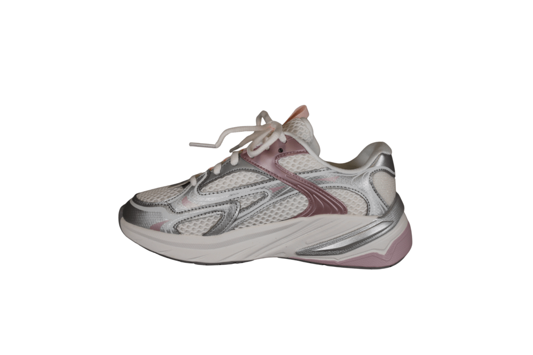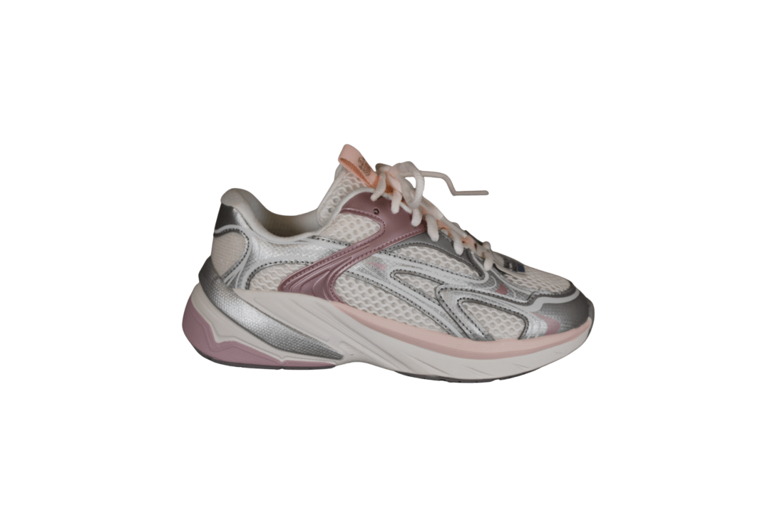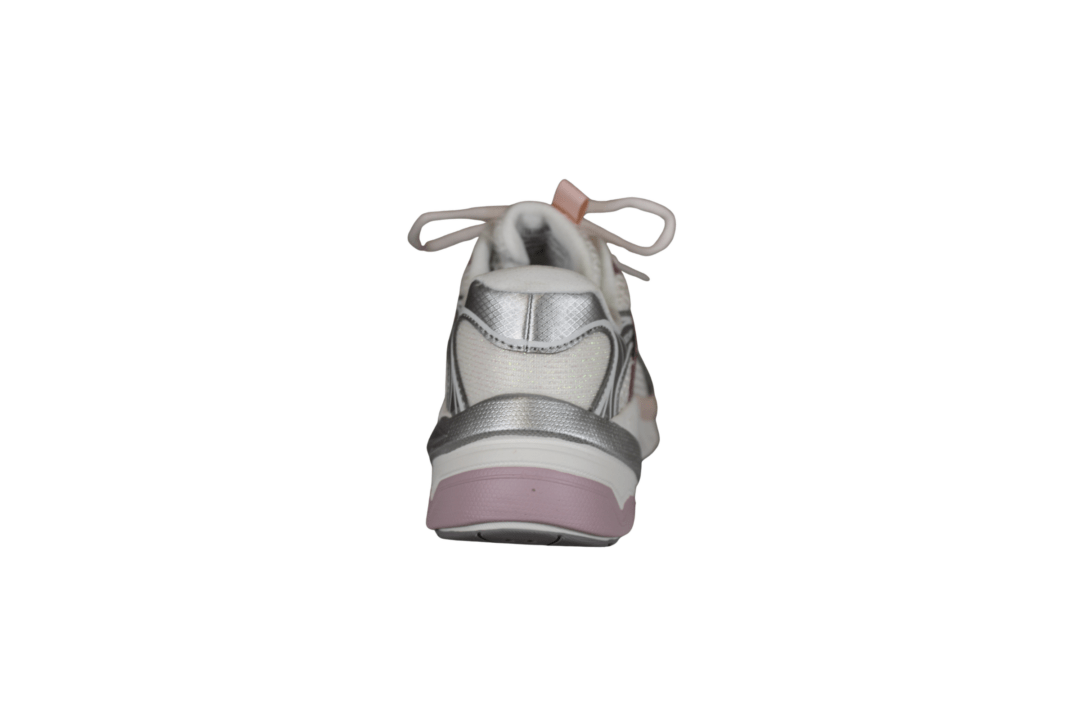 SKECHERS S2K 303697L/OFWT (741-3718). Flot off white senakers med rosa og sølv detaljer, ved sålen og overstykket, samt pløjsen. Glimmer på hælkappen. En utrolig let og fleksibel sko. Kan vaskes på lave grader, og derefter luftørres. en god sko til dalgi brug eller til pænere brug.