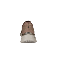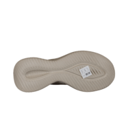 SKECHERS ULTRA FLEX 3.0 150642/TPE SLIP-INS (035-022). Helt enkelt taupe farvet sneakers med creme farvede såler. Ved hælkappen er der en guld streg, og betrukket med glimrende nitter. Skoen er lavet i strækbart tekstil materiale, men er vævet tæt rundt om foden. Indvendig har skoen memory foam, hvilket er blød og stødabsorberende. Hælkappen er SLIP-INS, hvilket betyder du intet skohorn skal bruge – man kan bare træde ned i skoen.