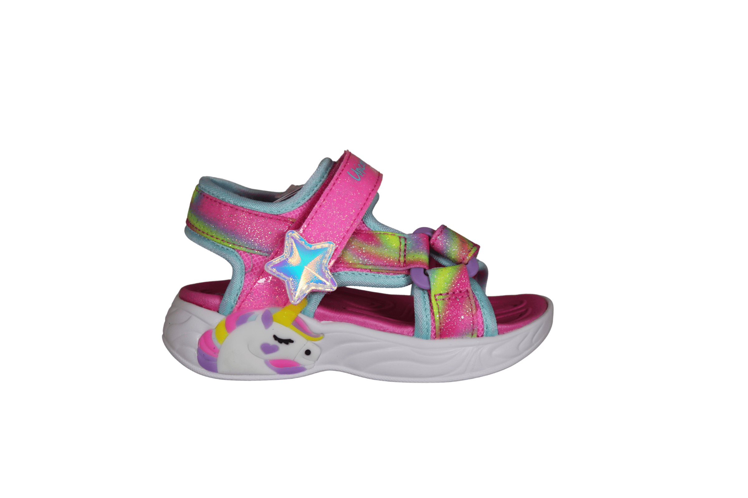 SKECHERS UNICORN DREAMS 303107N/PKMT (482-0626). Rigtig vegansk pigesandal med enhjørning og lys i sålerne. Lyserød med lyseblå kantbånd og multi farvet remme, sølv stjerne på velcro remmen. Kan reguleres med to velcro remme en ved forfoden og en over vristen. En meget let og fleksibel sandal.