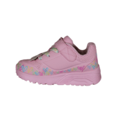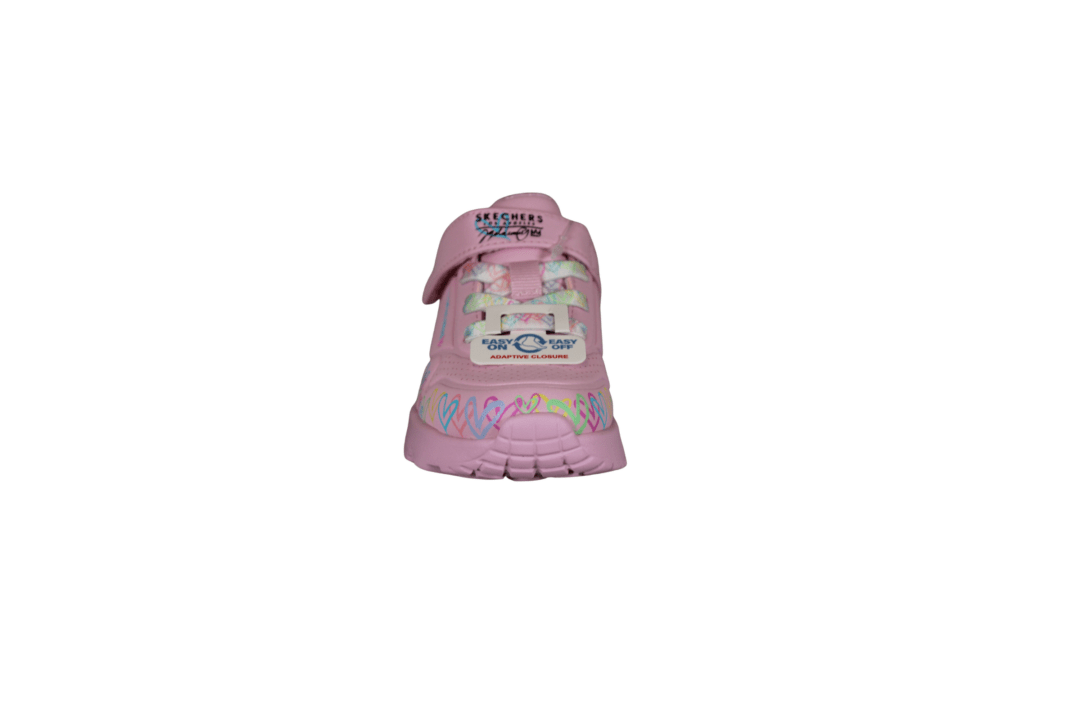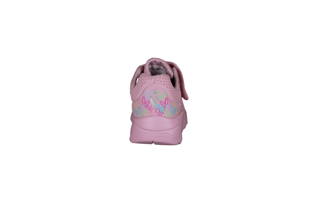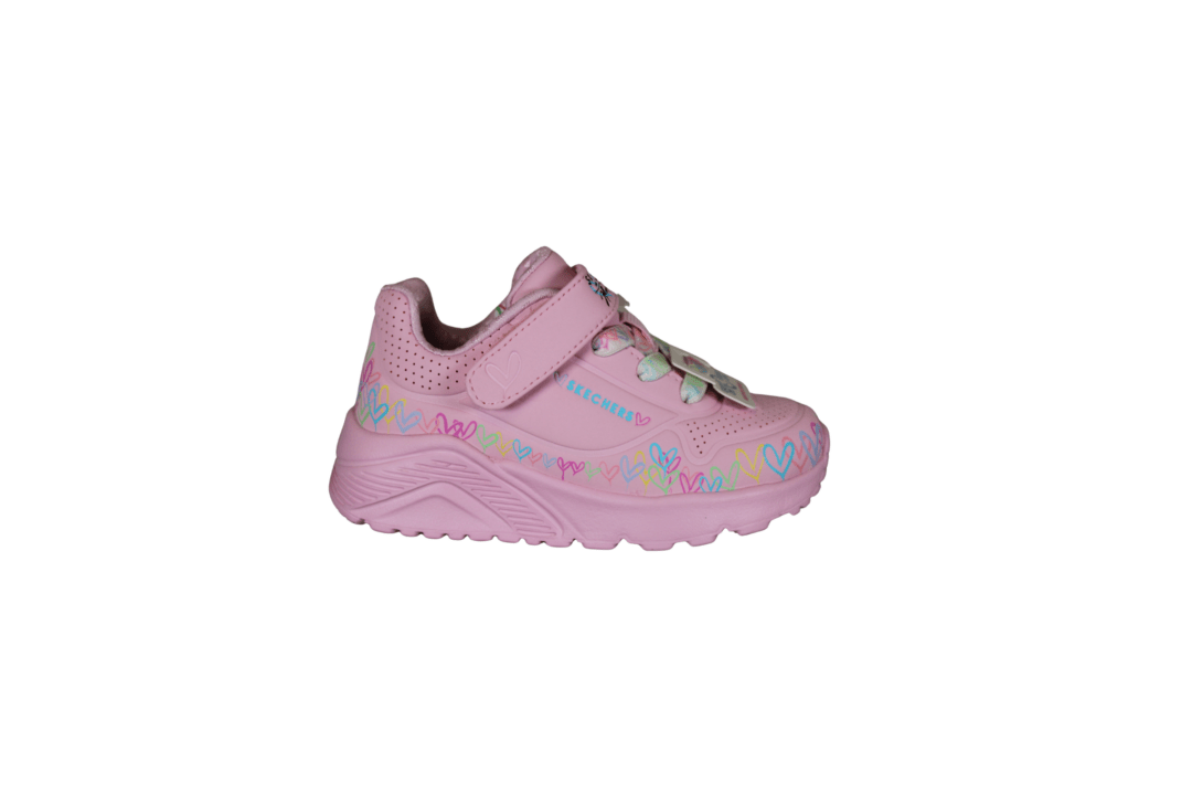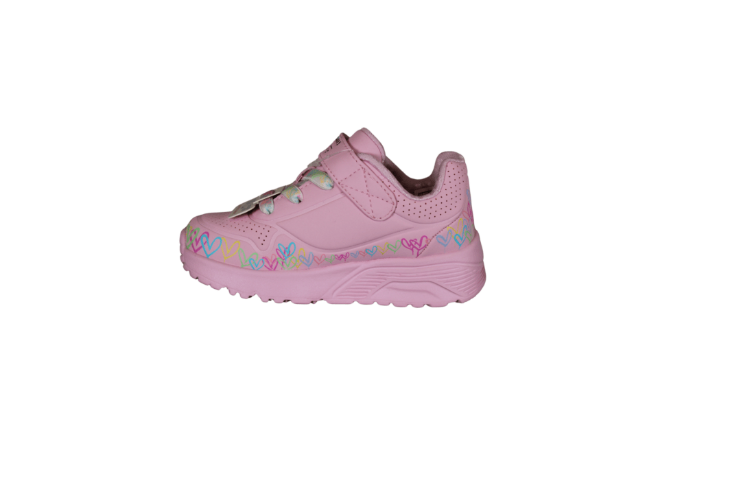 SKECHERS UNO LITE HEART CRAZE 314091N/LPMT (741-3740). Fin lille rosa Uno model til de små piger. Hjerter i forskellige farver ved sålen og på snørebåndet. Nem at komme i med et velcro bånd og elastik snørebånd. Modellen kan vaskes i maskinen på lave grader og derefter lufttørres. En god model til daglig brug eller til festerne.