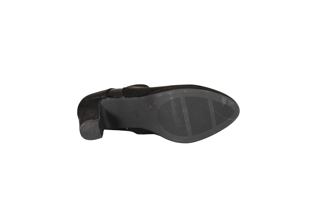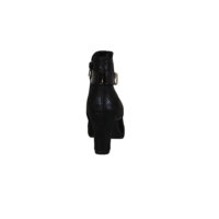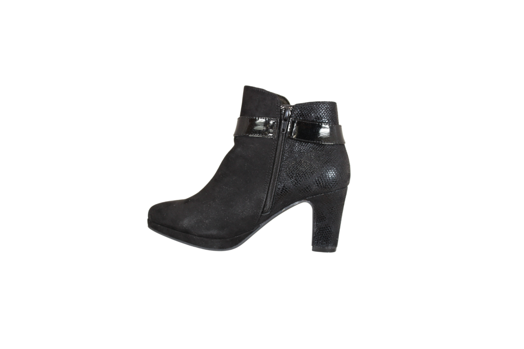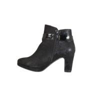 SPROX 428783 (053-523). Flot sort støvle med en 7,5 cm hæl. Støvlen er lavet i tekstil materiale både ind- og udvendig. Støvlen har glimmer materiale på hælen, samt en spænde på ydersiden. Ydersålen er lavet i gummi.