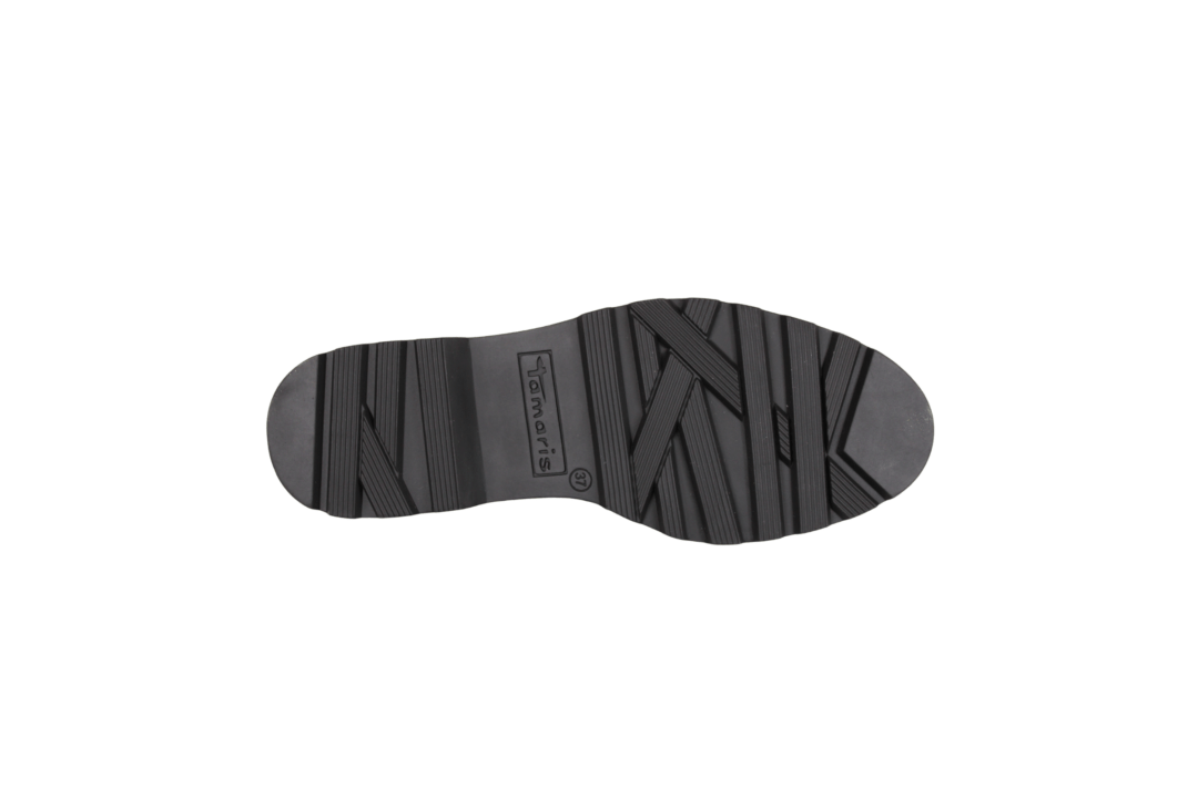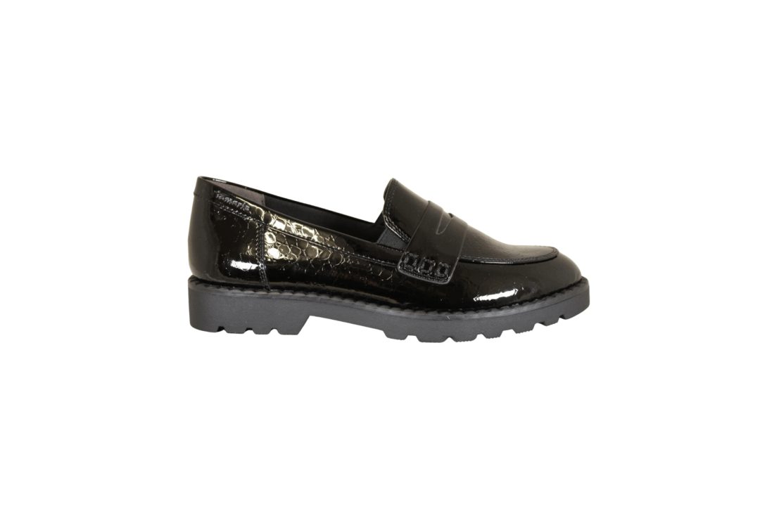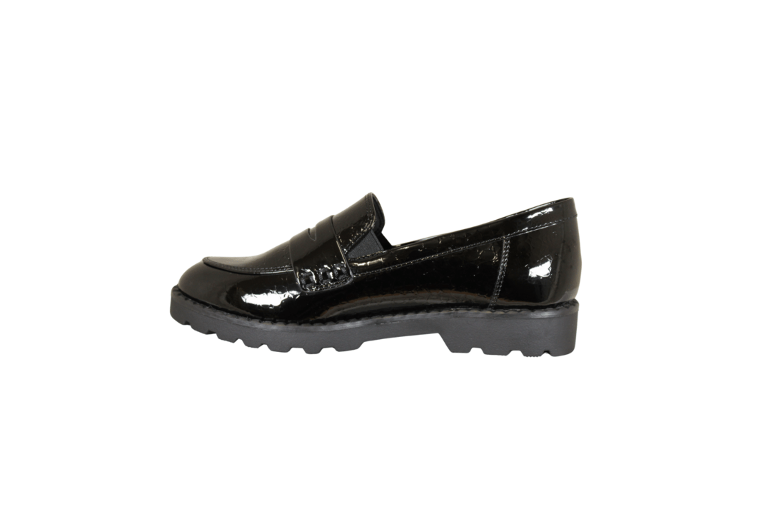 TAMARIS 1-24312-41 087 BLACK PATENT (241-1880). Sort loafers fra TAMARIS med lidt kraftig sål. Skoen er lavet i vegansk materiale både ind- og udvendig. Hen over vristen er der små elastikker i hver side, som kan give sig over vristen. Slidsålen er lavet i gummi. Denne type sko kan sagtens bruges både til hverdag, men også fest hvis man ikke er til en høj hæl.