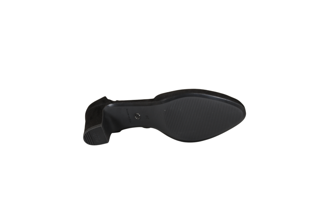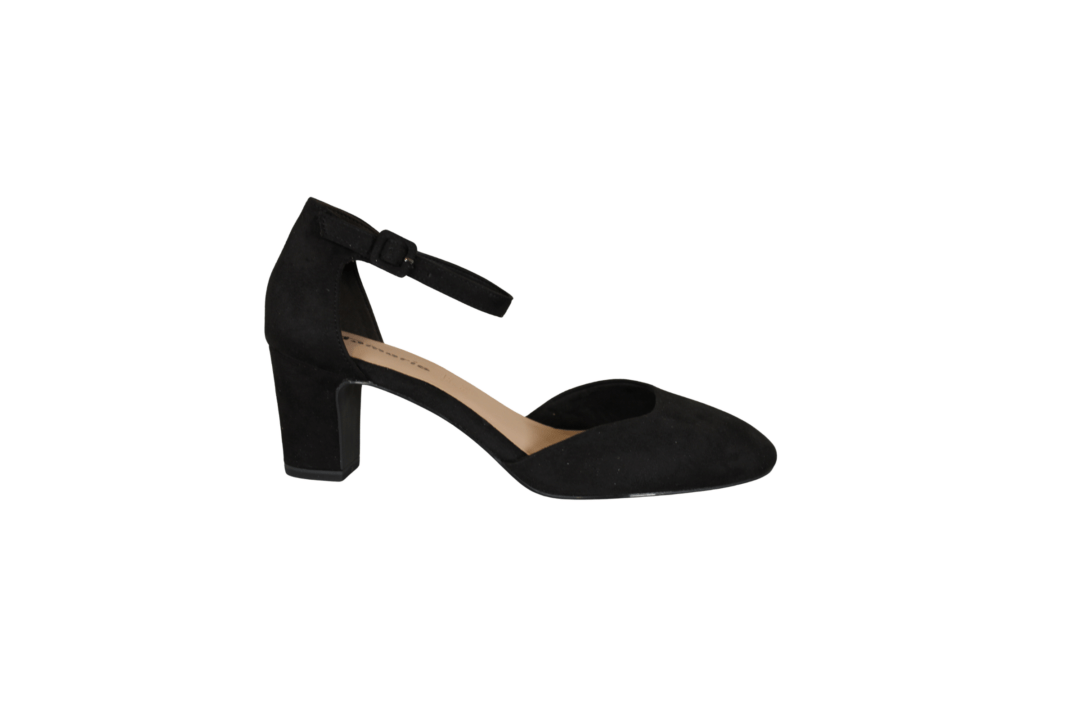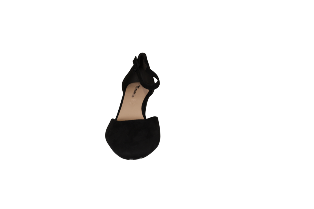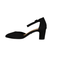 TAMARIS 1-24412-41 001 BLACK (221-2060). Sort pumps med lukket snude og hælkappe. Hælen er 6 cm høj. Rundt om ankelen sidder en tynd rem der kan spændes ind og ud. Materialet er tekstil udvendig, og foret med vegansk materiale indvendig.